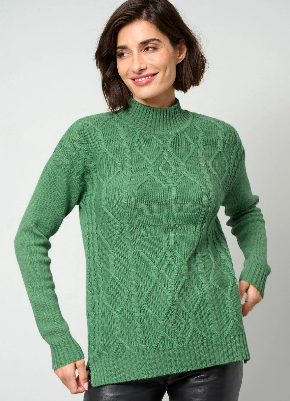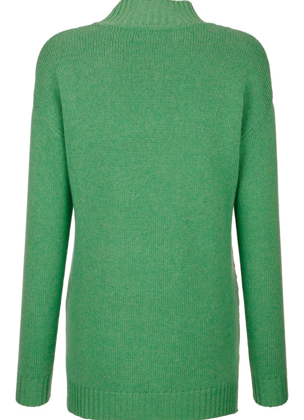 Pullover mit Stehbund, Rippenabschlüssen, langen Ärmeln, Seitenschlitzen, verlängertem Rückteil sowie Strukturdessin im Vorderteil.