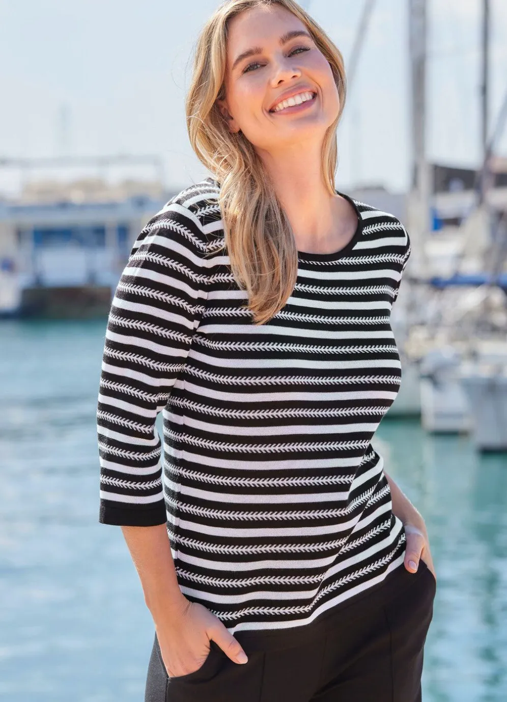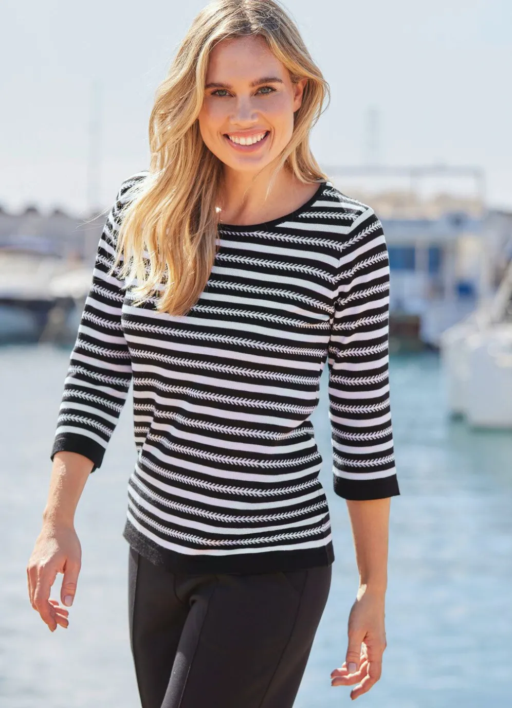 Kombifreundlicher Pullover in Schwarz-Weiß, mit rundem Halsausschnitt, schickem Streifendessin allover, 3/4-langen Ärmeln sowie kontrastfarbenen Abschlüssen.