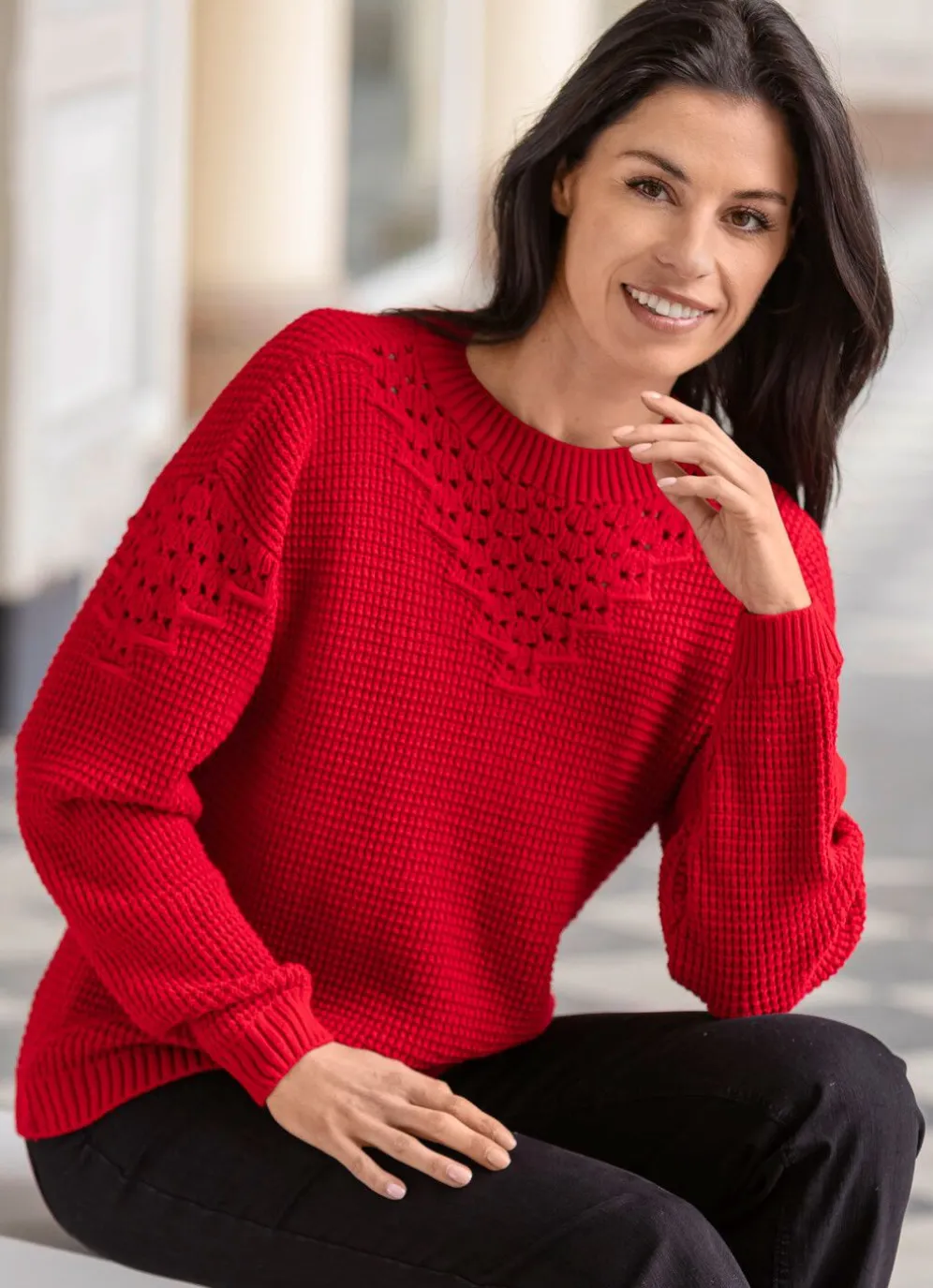 Zauberhafter Pullover in Rot mit rundem Halsausschnitt, modischer, überschnittener Schulterpartie, Strukturmuster allover, Ajourdessin im oberen Bereich des Vorderteils und an den langen Ärmeln sowie gerippten Abschlüssen.