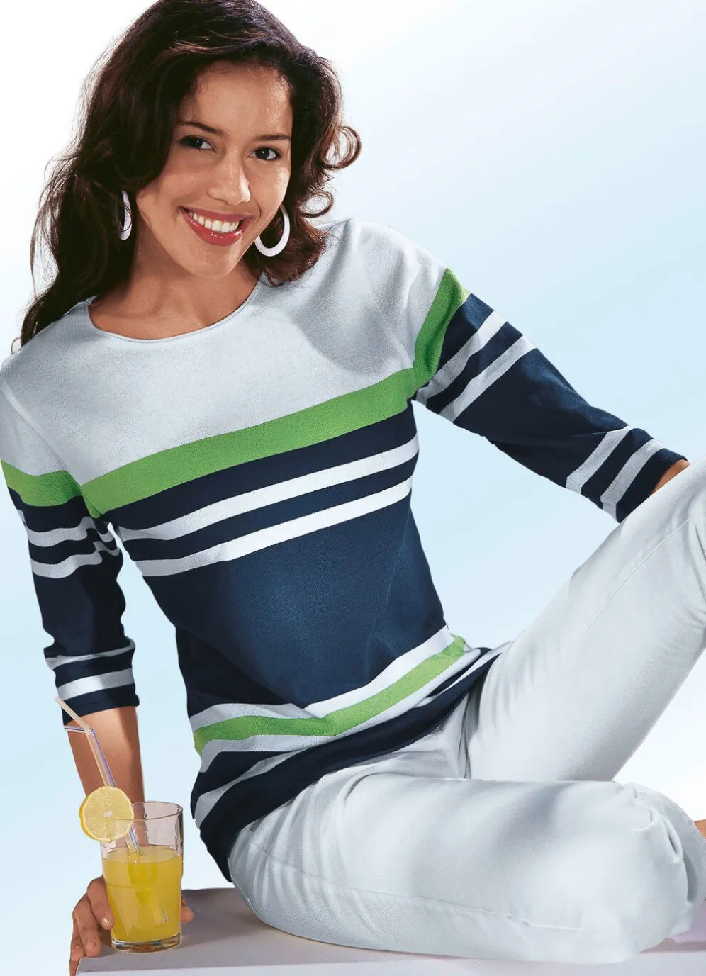 Taillierter Pullover mit marine-weiß-grünem Streifendessin allover, fein rolliertem Halsausschnitt sowie 3/4-langen Ärmeln.