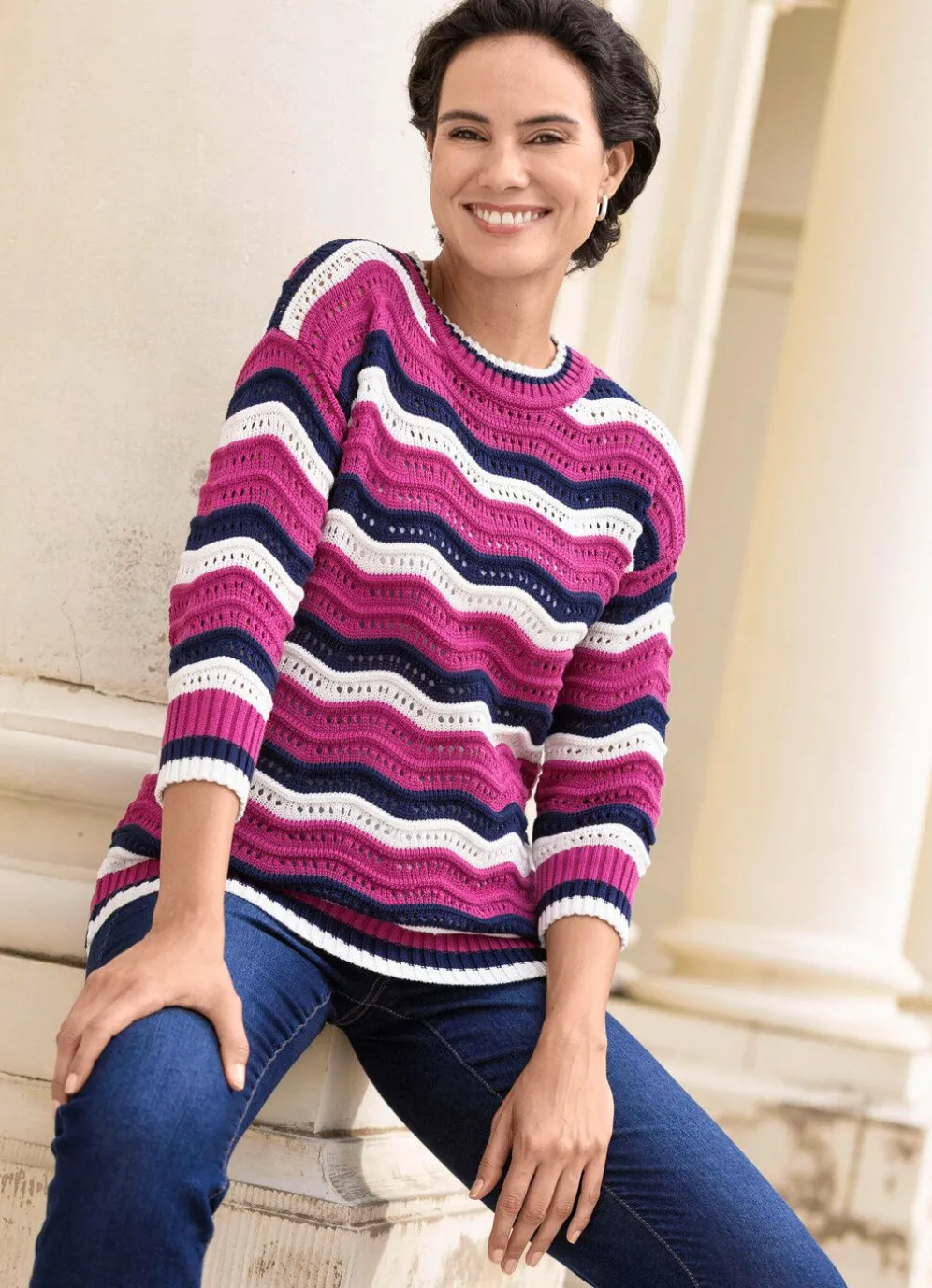 Ein flotter Hingucker ist dieser Pullover mit aufwendigem Ajourstrick im Wellendessin allover: runder Halsausschnitt, Ärmel in modischer Länge sowie Rippenbundabschlüsse.