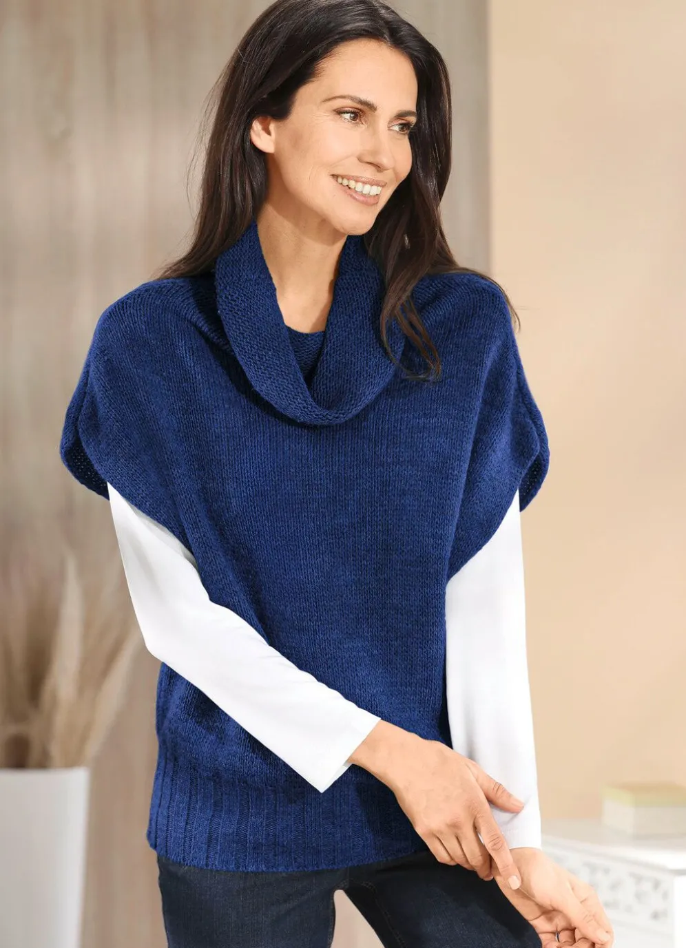 Der ideale Kombibegleiter ist dieser hochwertige Pullunder in überschnittener Form, mit weitem Rollkragen sowie Rippenstrickabschluss am Saum.