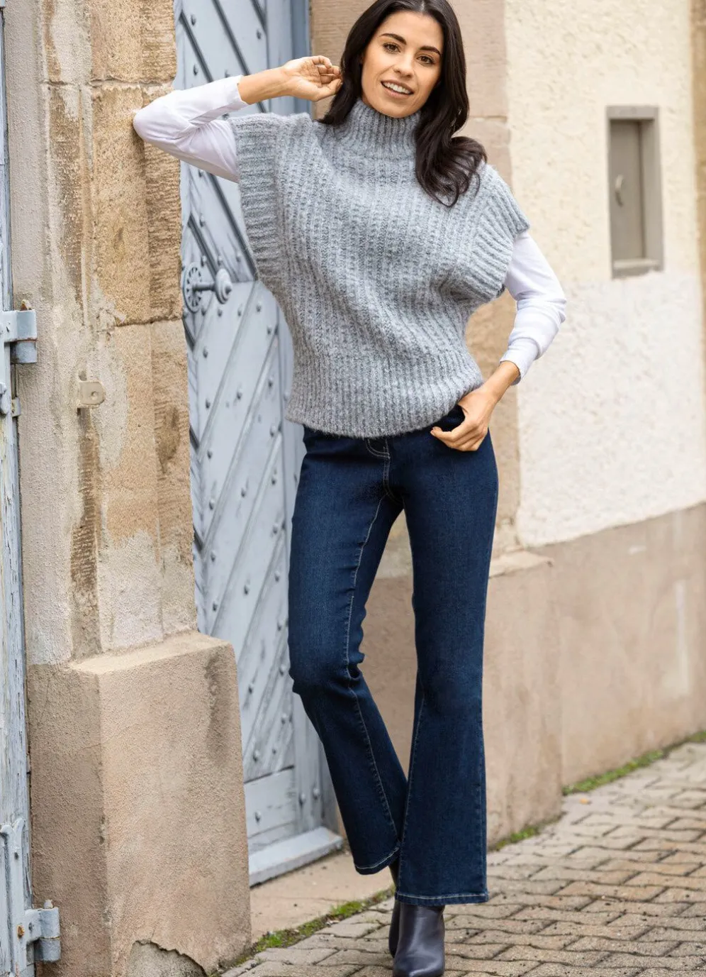 Grau melierter Pullunder in überschnittener Form mit Stehbund, streckendem Strukturmuster allover sowie Rippenbundabschlüssen.