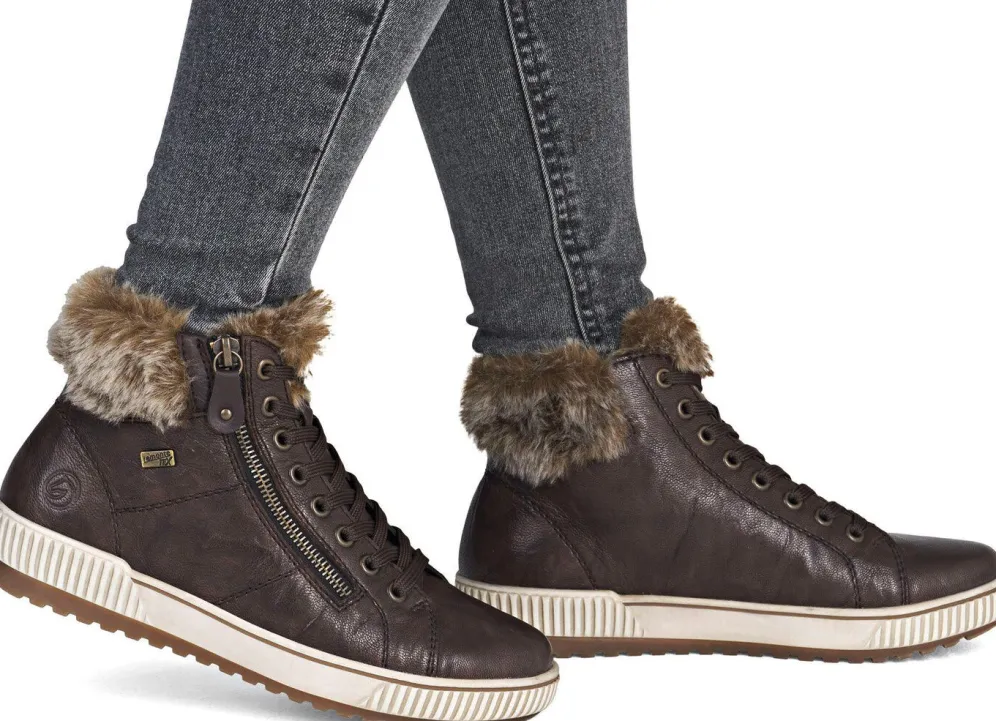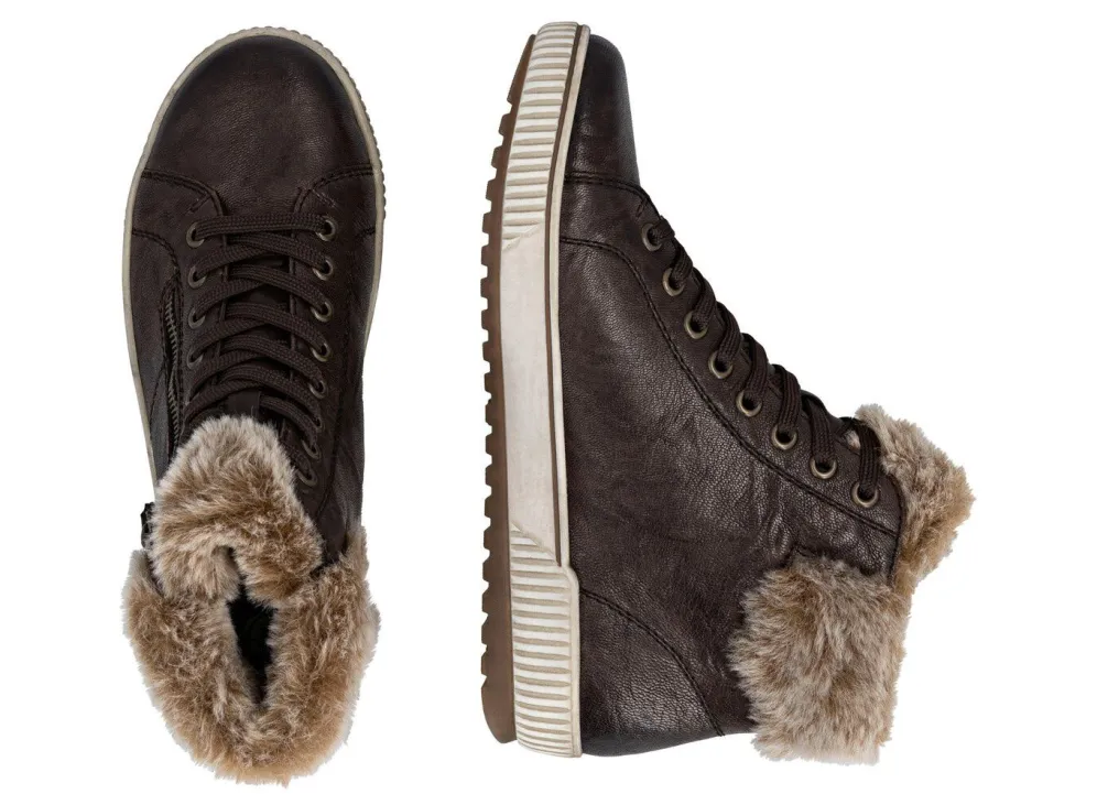 Boots aus Nappaleder mit dezenter Knitter-Struktur und meliertem Plüsch-Kragen: Weite G, Schnürung, seitlicher Reißverschluss, mit Klimamembrane ausgestattet, Warmfutter aus Lammwolle, herausnehmbares Fußbett, leichte TR-Profilsohle sowie 15 mm Keilabsatz. Schafthöhe ca. 9 cm