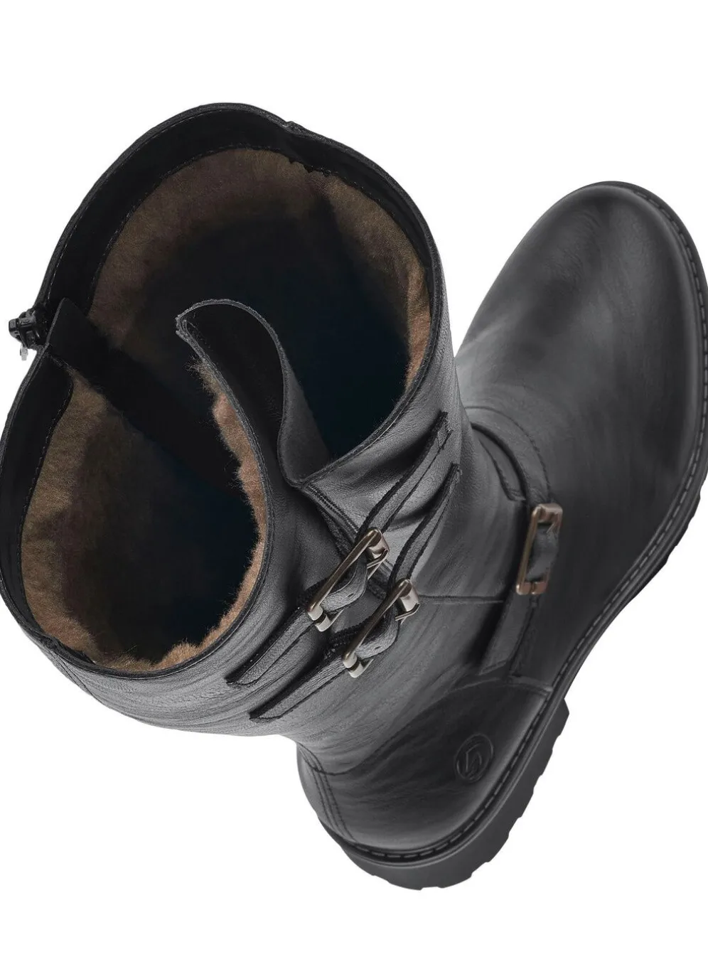 Stiefel aus hochwertigem Synthetik mit Narben-Struktur: zwei verstellbare Spangen mit verdeckten Gummizügen zur Weiten-Regulierung. Weite G, Zierschnalle, Innenreißverschluss, molliges Warmfutter aus echtem Lammfell und Plüschmaterial aus 80% Polyacryl und 20% Polyester, herausnehmbare Decksohle, TR-Profilsohle sowie 20 mm Absatz. Schafthöhe ca. 37 cm, Wadenweite ca. 38-42 cm