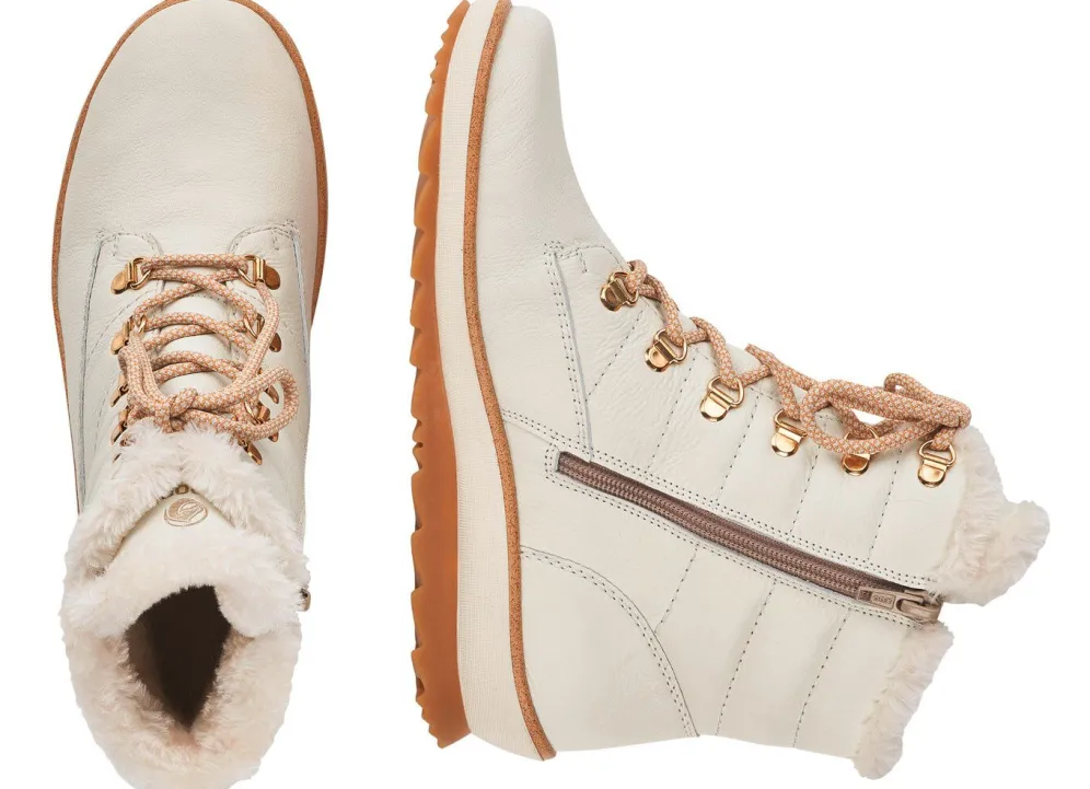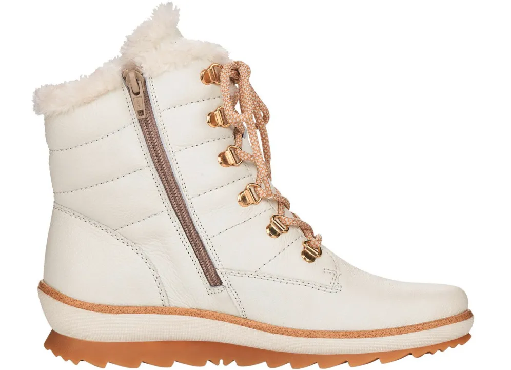 Kuschelige Stiefeletten aus naturweißem, genarbtem Nappaleder, mit Plüschkragen, Schnürung und Innenreißverschluss: in Weite G, mit Klimamembrane ausgestattet, Warmfutter aus reiner Lammwolle, warme, herausnehmbare Decksohle, leichte TR-Profilsohle sowie 25 mm Keilabsatz. Schafthöhe ca. 14 cm