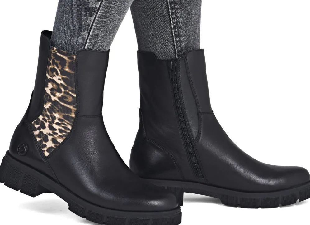 Modische Stiefeletten in Schwarz-Braun aus Nappaleder und Synthetik, mit seitlichem Elastikeinsatz in schickem Leo-Print: Weite G, praktischer Innenreißverschluss, wärmendes Textilfutter, gepolsterte Decksohle, leichte TR-Profilsohle sowie 20 mm Absatz. Schafthöhe ca. 17 cm