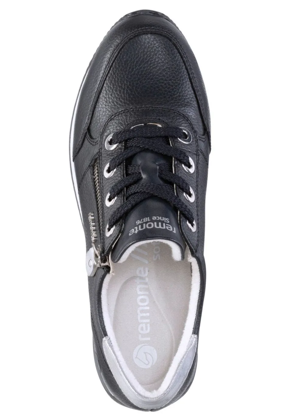 Schnür-Sneaker aus genarbtem Nappaleder, mit silberfarben schimmerndem Kontast-Besatz: seitlicher Reißverschluss, Textilfutter, herausnehmbares Fußbett sowie leichte PU-Riffelsohle mit 15 mm Keilabsatz