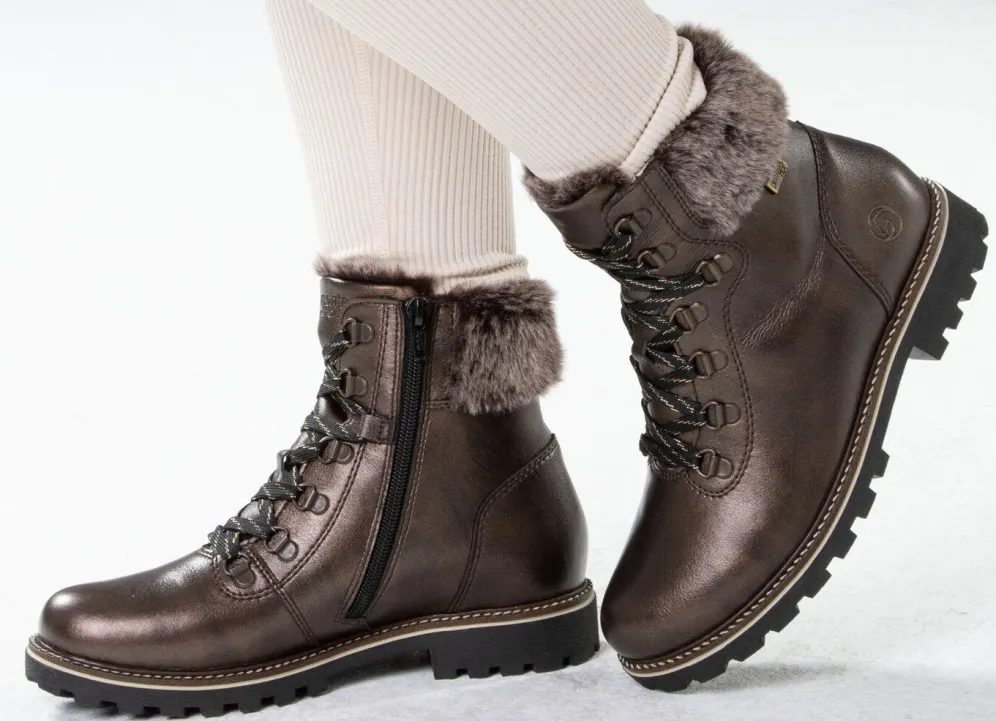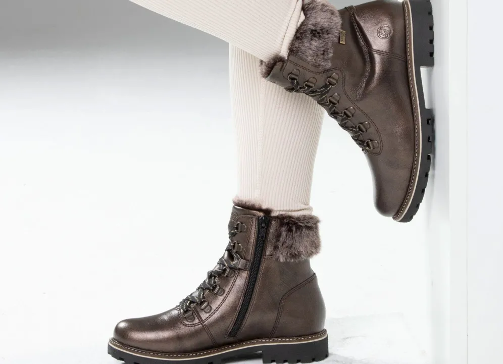 Schnür-Stiefelette aus teilweise schimmerndem Nappaleder mit Plüschkragen: mit Klimamembrane ausgestattet, praktischer Innenreißverschluss, Warmfutter und warme Decksohle, leichte TR-Profilsohle sowie 15 mm Absatz. Schafthöhe ca. 14 cm