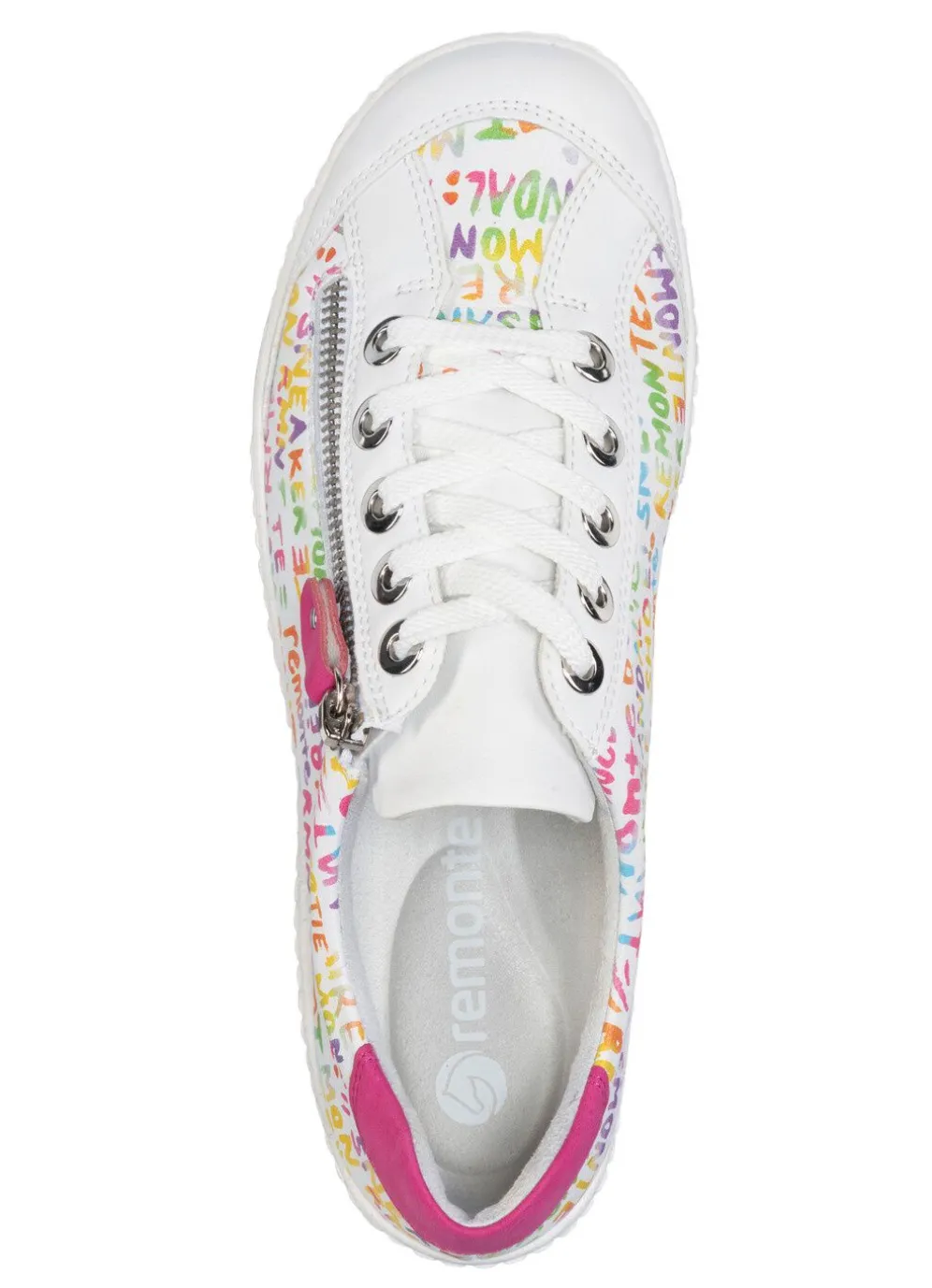 Sneaker in Weiß-Bunt, aus beschichtetem, frech bedrucktem Leder und Synthetik, mit Schnürung und seitlichem Reißverschluss: Weite G, Futter, herausnehmbare Einlage, TR-Profilsohle sowie 15 mm Keilabsatz