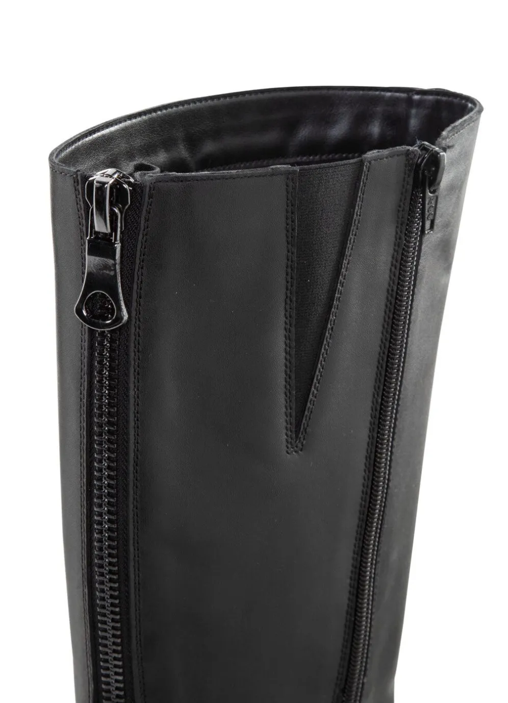 Schwarzer Stiefel aus Nappaleder mit seitlichem Gummizug: rückwärtiger Reißverschluss zur Weitenregulierung, Innenreißverschluss, wärmendes Textilfutter, gepolsterte Decksohle, TR-Profilsohle und 25 mm Absatz. Schafthöhe ca. 40 cm, variable Wadenweite bei Gr. 37 ca. 35-37 cm