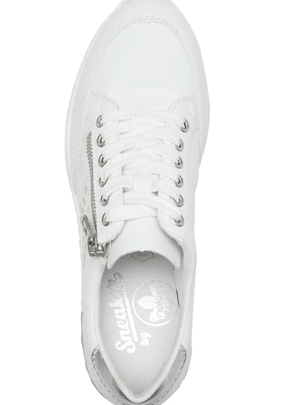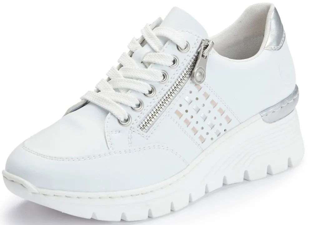 Weiße Sneaker aus Synthetikmaterial, mit Metallicbesätzen: Weite G, Schnürung, praktischer Seitenreißverschluss, Quartier mit Textilfutter, herausnehmbare Ledereinlage, leichte Synthetik-Profilsohle sowie 35 mm Keilabsatz