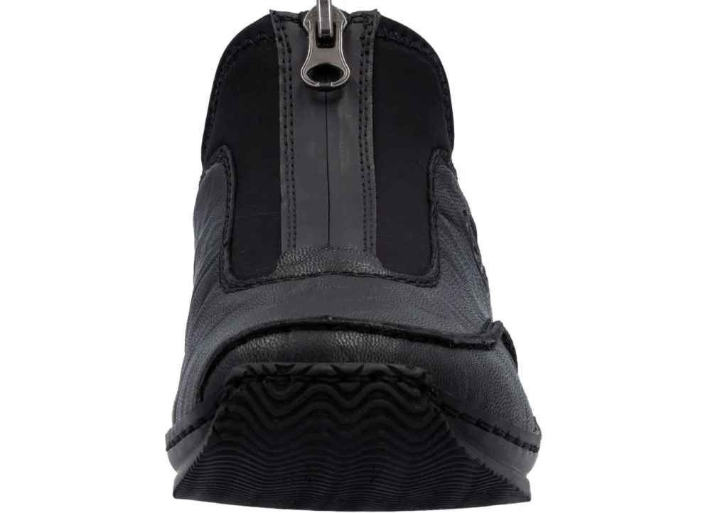 Schwarze Slipper aus genarbtem Nappaleder und dehnbarem Textilmaterial: Front-Reißverschluss, Textilfutter sowie Lederdecksohle weich gepolstert, leichte Synthetik-Riffelsohle und 10 mm Keilabsatz