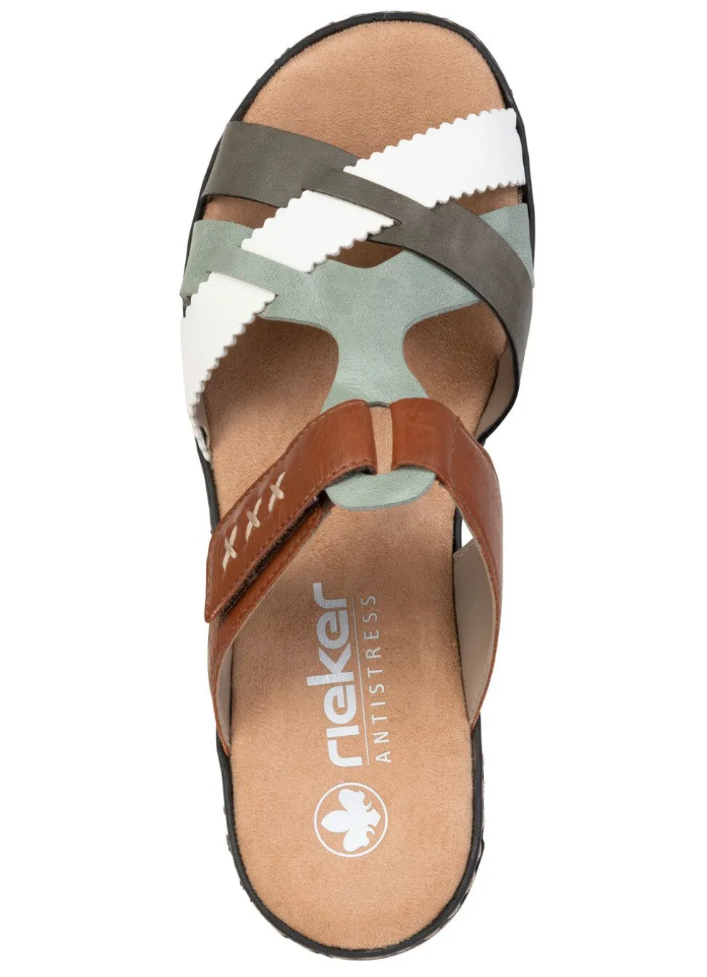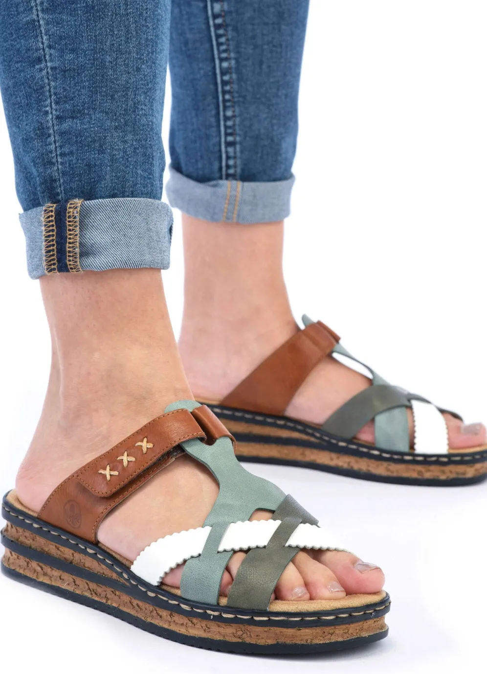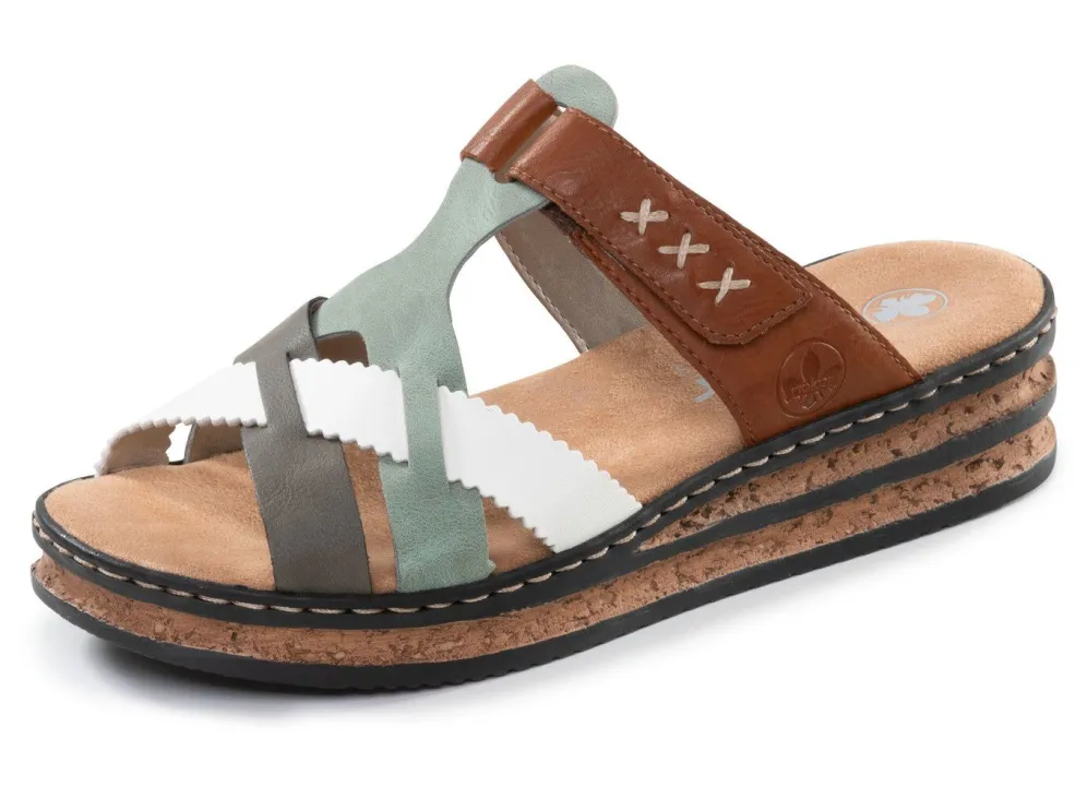 Pantoletten in Multicolor aus Synthetik mit Riemchen und verstellbarem Klettverschluss: Futter, gepolsterte Textil-Decksohle, leichte Synthetik-Riffelsohle sowie 20 mm Keilabsatz