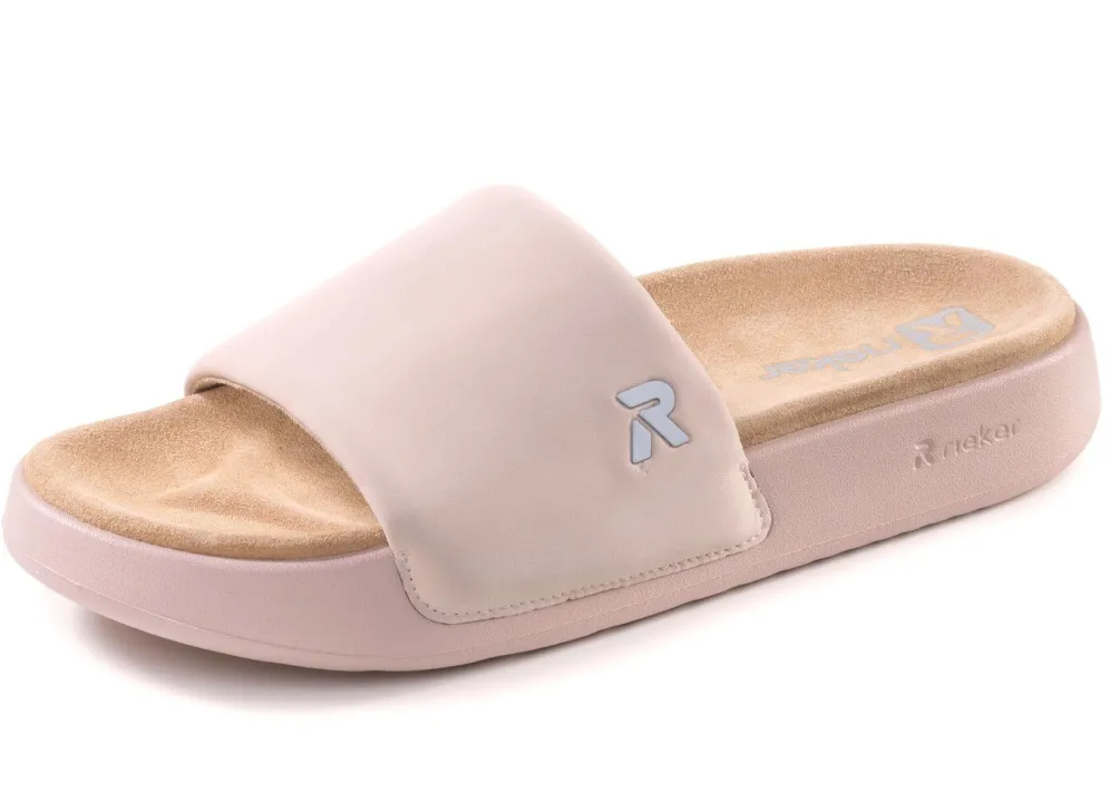 Lässige Slides aus Synthetik: weiches Futter, gepolsterte Lederdecksohle, superleichte EVA-Riffelsohle sowie 10 mm Keilabsatz