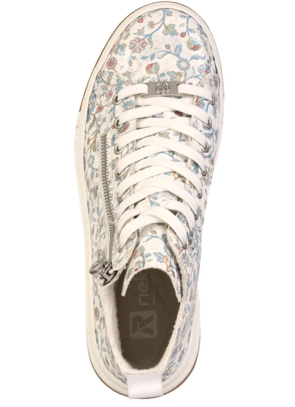 Boots in Weiß-Bunt aus floral bedrucktem Synthetikmaterial mit Zier-Perforation: Weite G, Schnürung und Seitenreißverschluss, Textilfutter, herausnehmbares Fußbett, leichte TR-Profilsohle mit 10 mm Keilabsatz. Schafthöhe ca. 10 cm