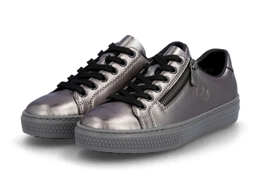 Sneaker in Altsilber aus beschichtetem Metallic-Leder, mit Schnürung und Seitenreißverschluss: Futter, weich gepolsterte Decksohle sowie leichte TR-Riffelsohle mit flachem 30 mm Plateauboden