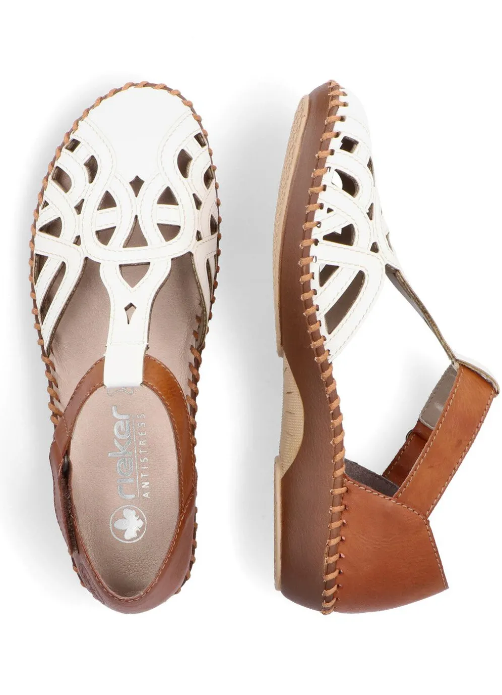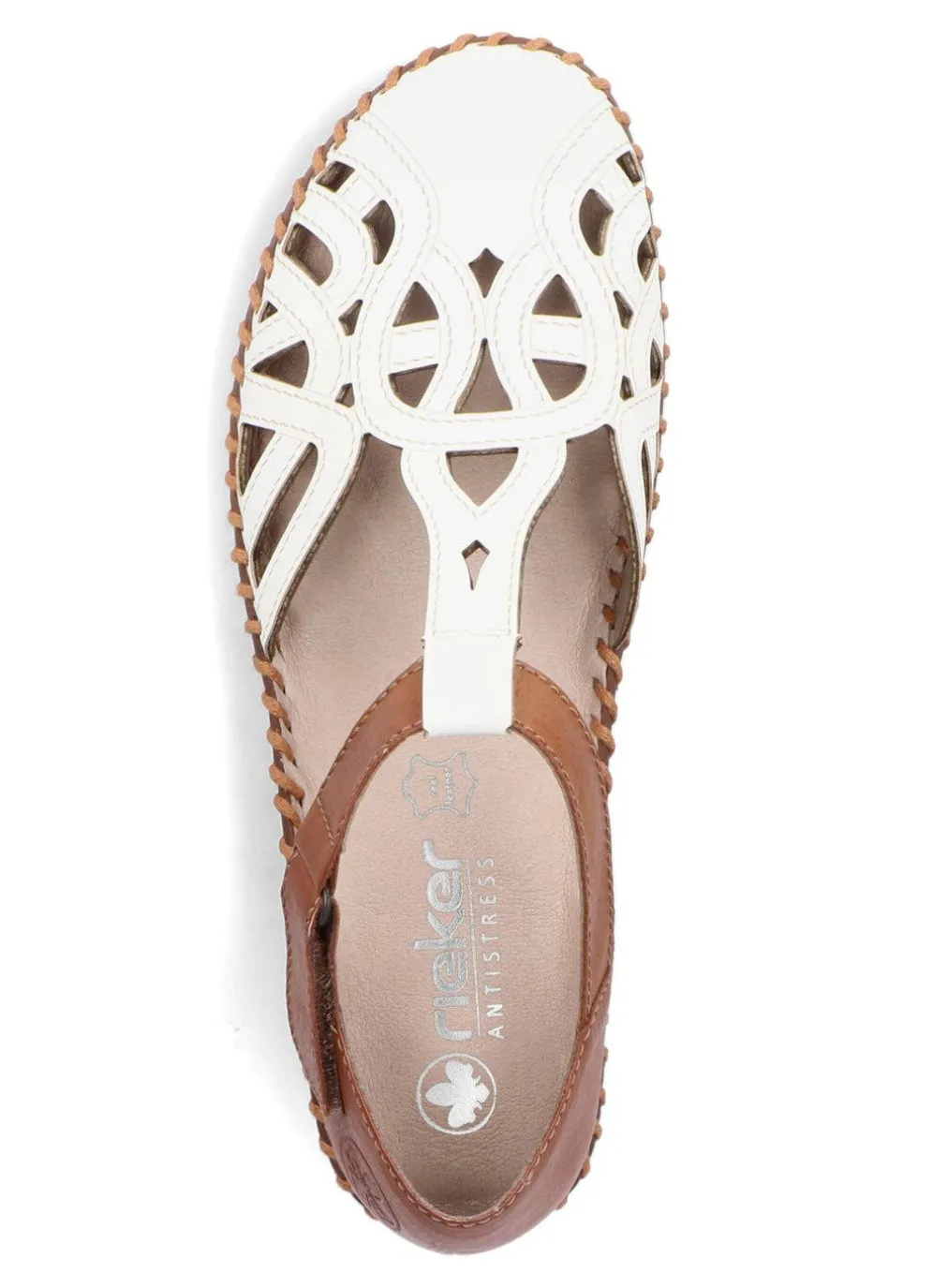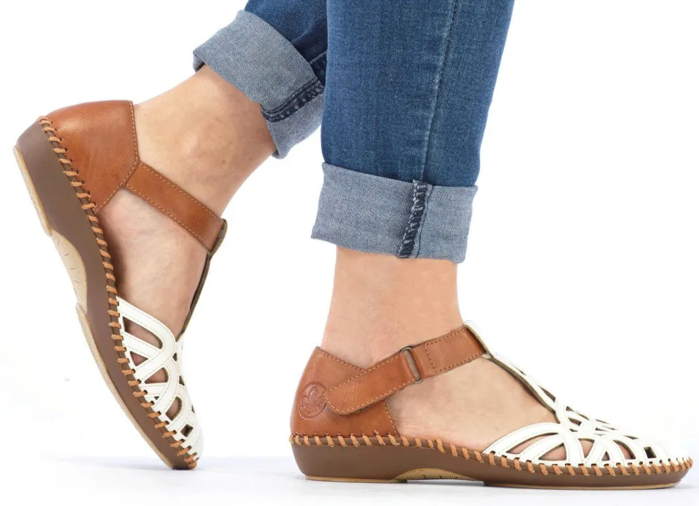Luftig perforierte Sandale in Creme-Cognac aus Synthetik: Weite G, Klettverschluss, Futter, gepolsterte Lederdecksohle, superleichte Synthetik-Laufsohle sowie 20 mm Absatz