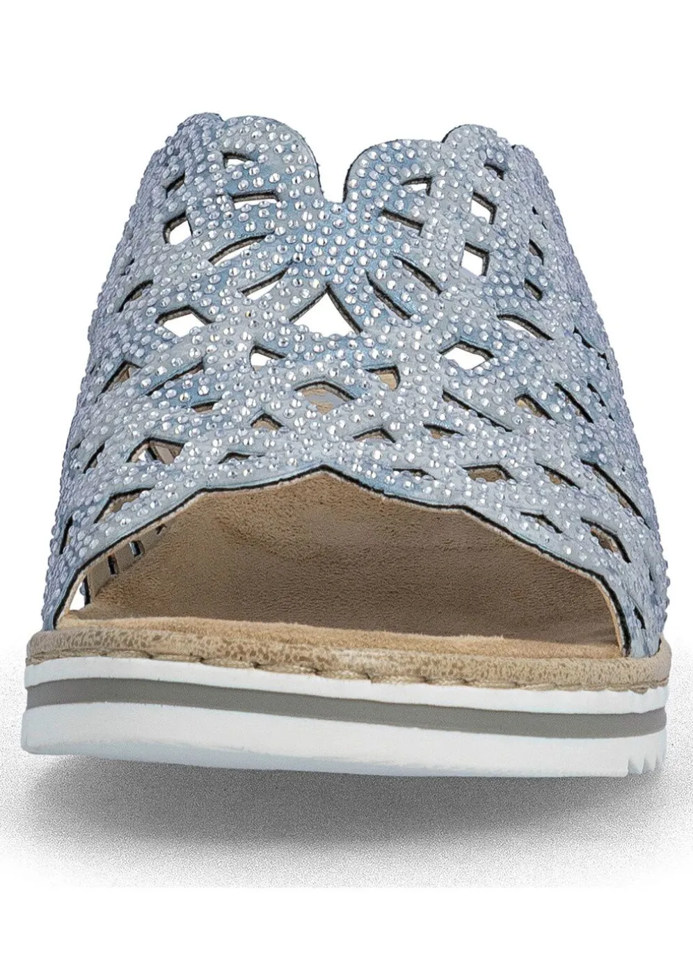 Mit Glitzersteinchen verzierte Pantoletten aus Synthetik mit luftigen Durchbrüchen: Futter, gepolsterte Decksohle, leichte Synthetik-Laufsohle sowie 20 mm Keilabsatz