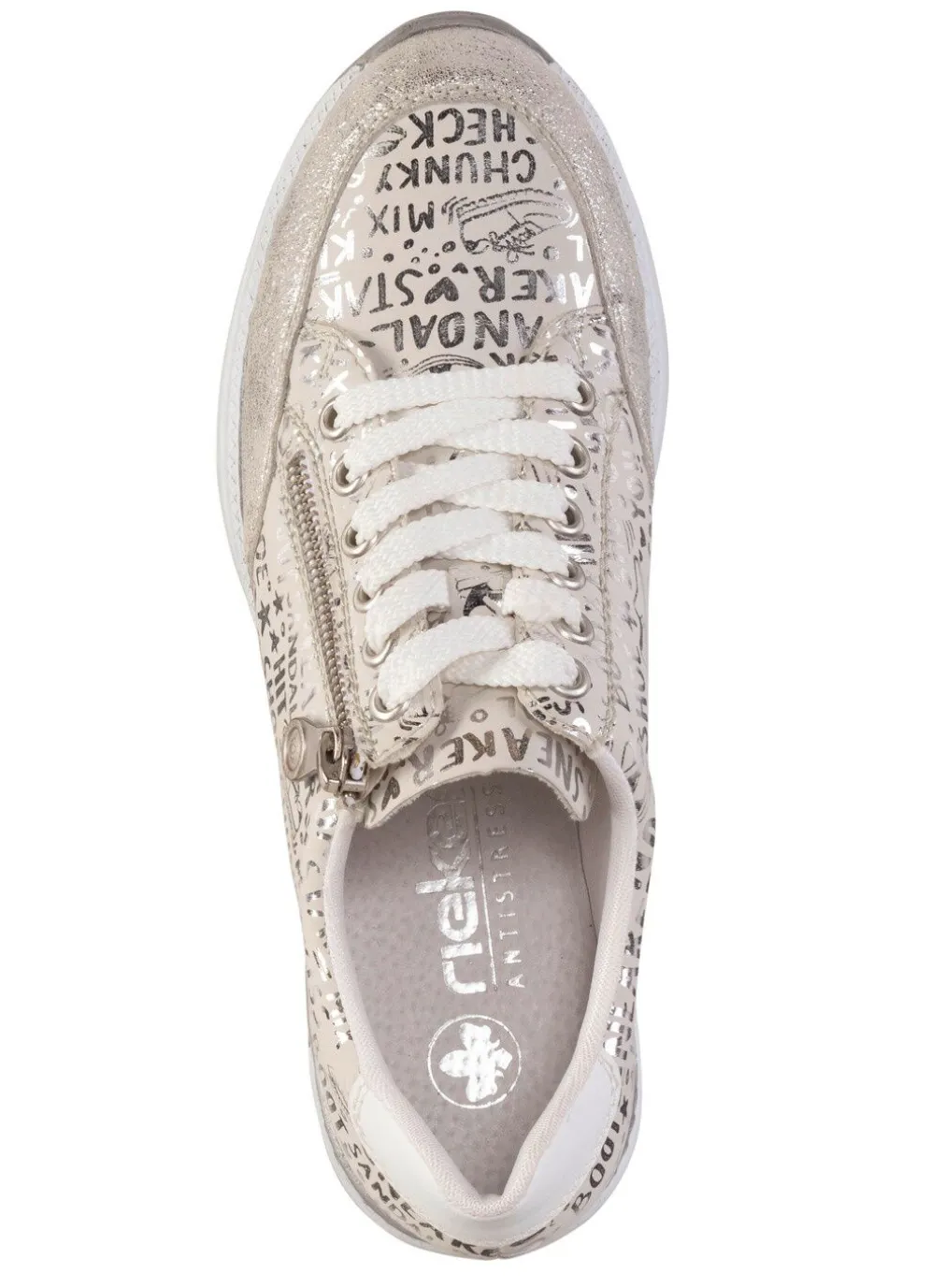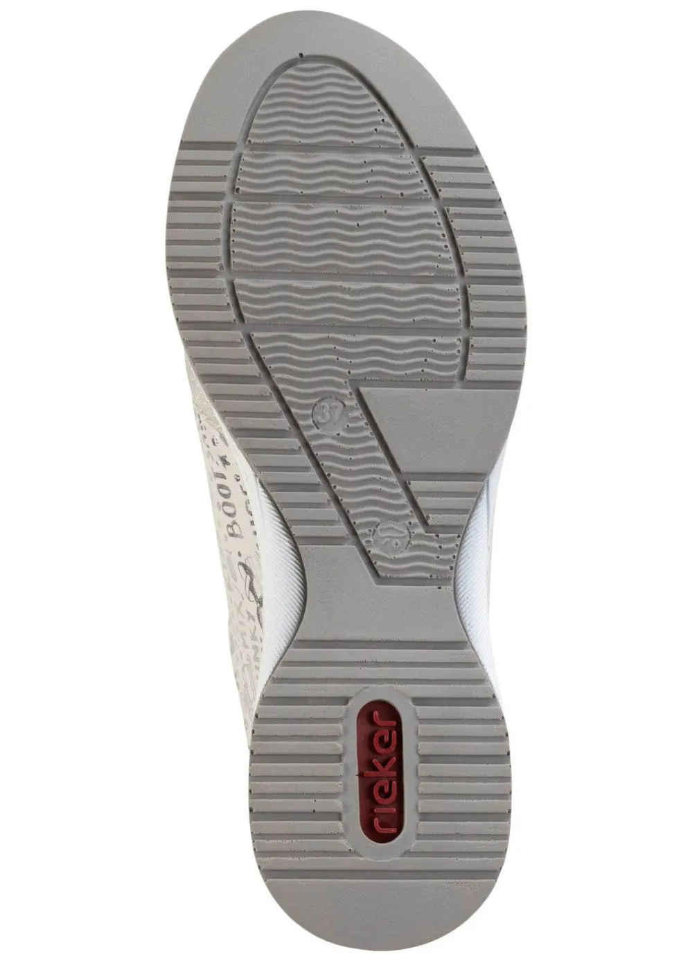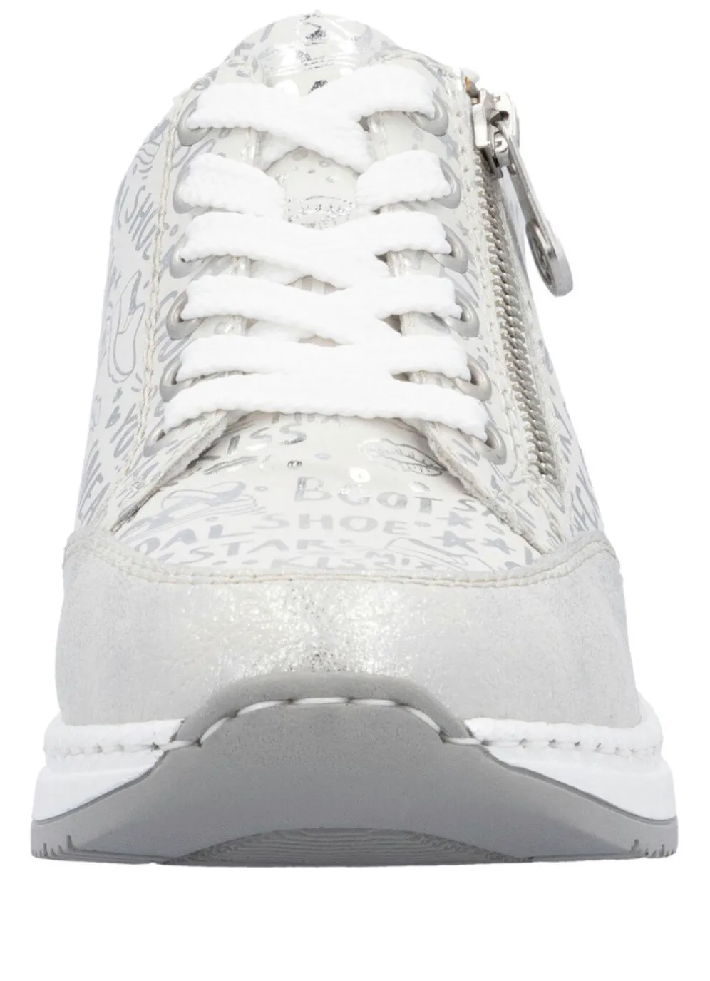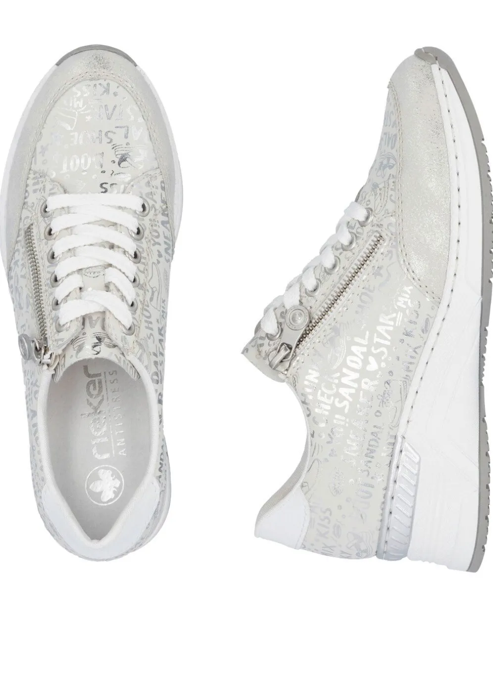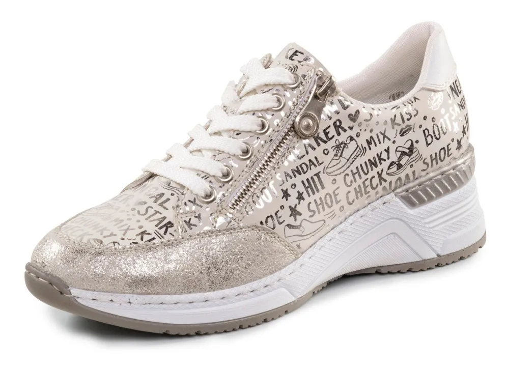 Schnür-Sneaker aus bedrucktem Synthetikmaterial mit schimmernden Besätzen und seitlichem Reißverschluss: Weite G, Textilfutter, herausnehmbares Lederfußbett, leichte Synthetik-Riffelsohle sowie 30 mm Keilabsatz