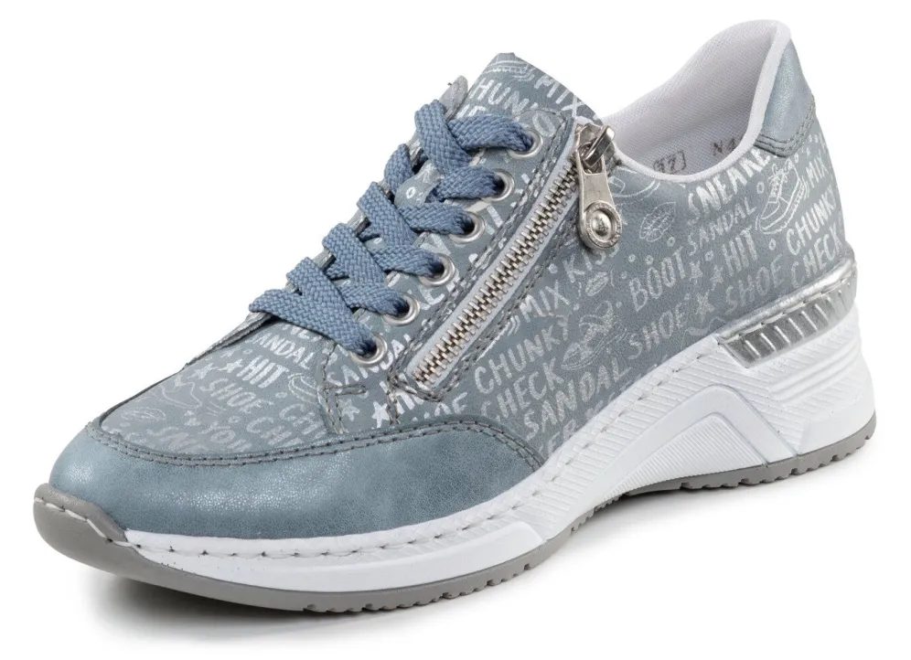 Schnür-Sneaker aus bedrucktem Synthetikmaterial mit schimmernden Besätzen und seitlichem Reißverschluss: Weite G, Textilfutter, herausnehmbares Lederfußbett, leichte Synthetik-Riffelsohle sowie 30 mm Keilabsatz