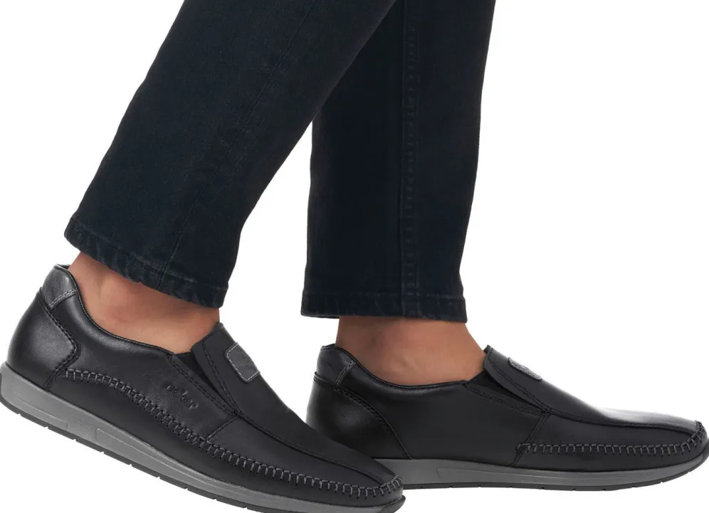 Schwarzer Slipper aus Nappaleder mit grauen Besätzen: seitliche Gummizüge, Futter, gepolsterte Lederdecksohle sowie superleichte Synthetik-Profilsohle