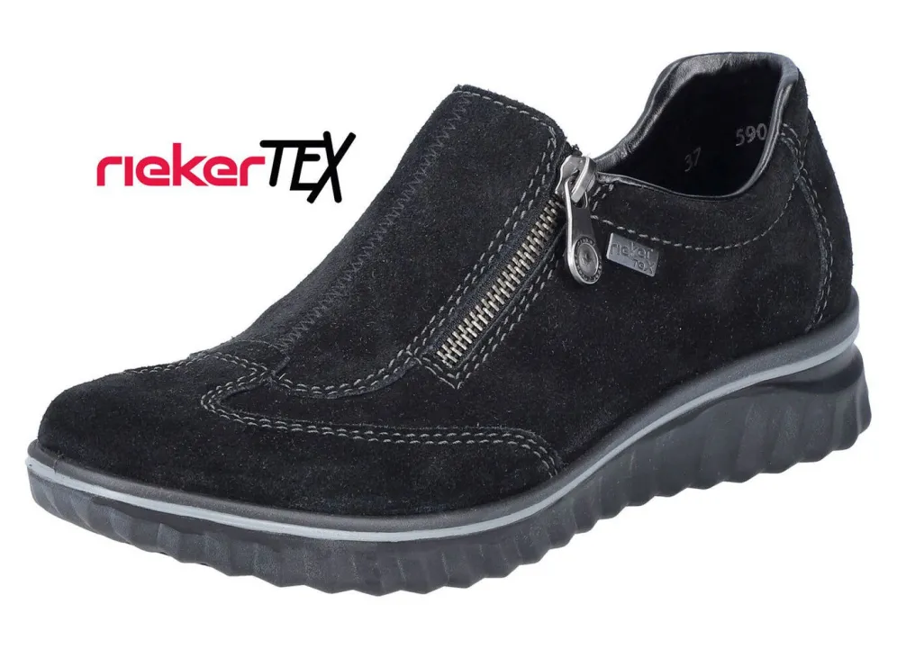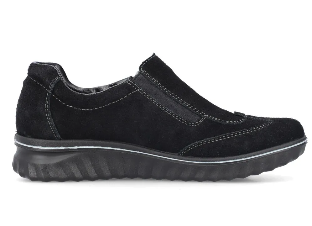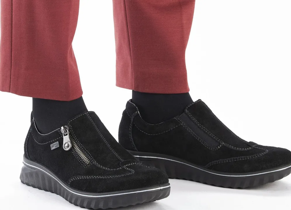 Slipper aus Veloursleder, mit Klimamembrane ausgestattet: seitlicher Reißverschluss, Gummizug, Textilfutter, herausnehmbares Textil-Fußbett, Synthetik-Profilsohle sowie 15 mm Keilabsatz