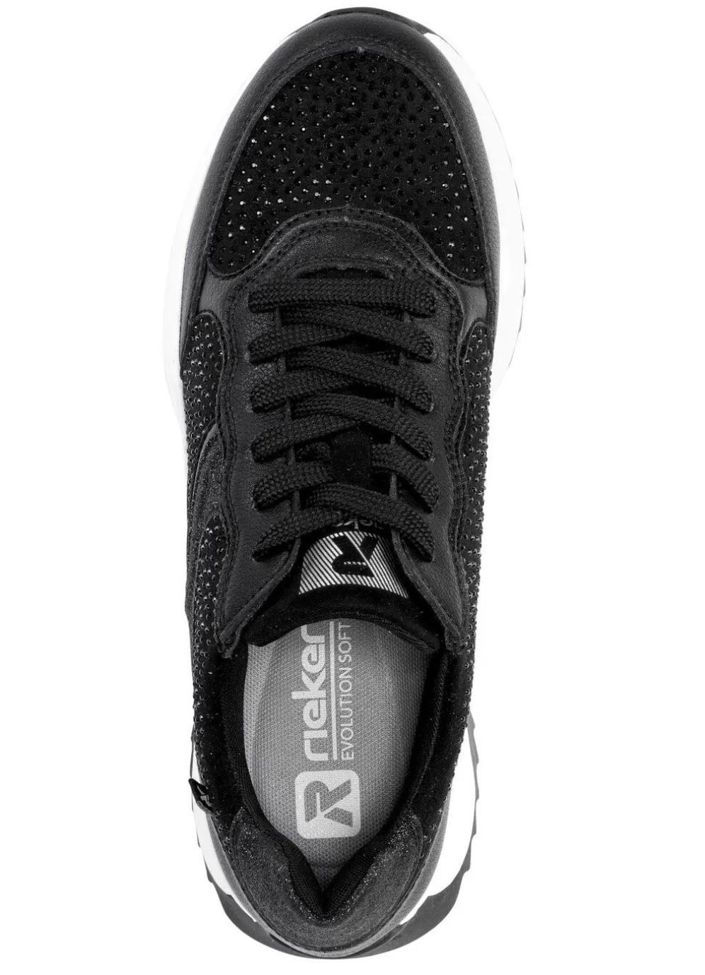 Mit Glitzersteinchen verzierter Sneaker aus Synthetik und teilweise schimmernd geprägtem Leder: Weite G, Schnürung, Textilfutter, herausnehmbares Fußbett, leichte TR-Profilsohle sowie 20 mm Keilabsatz