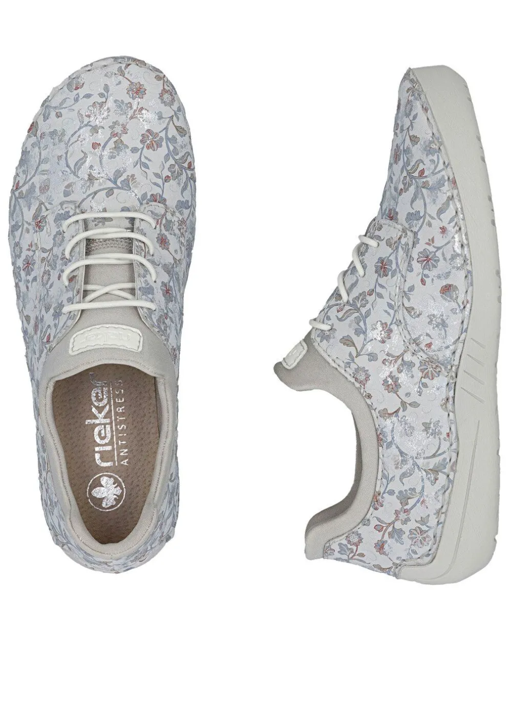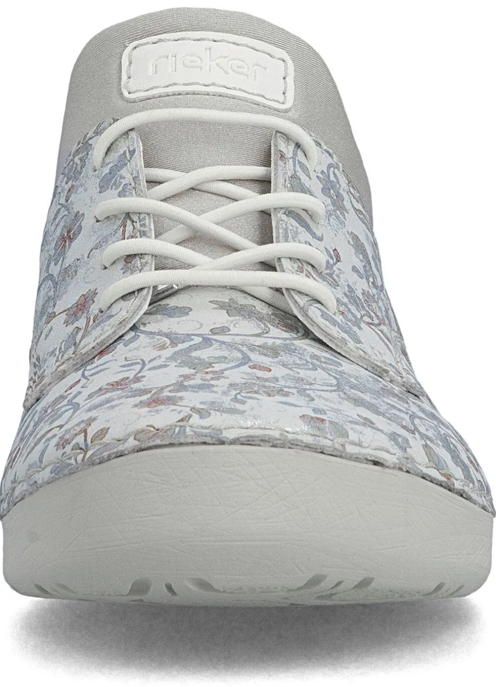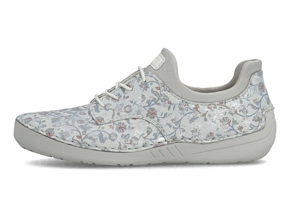 Sneaker aus floral bedrucktem Synthetik und zart glänzendem Textil: elastische Zierschnürung, Textilfutter, gepolsterte Decksohle, leichte Synthetik-Laufsohle sowie 15 mm Keilabsatz