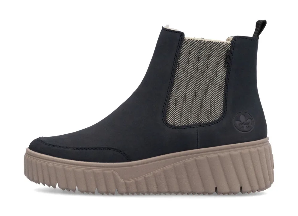 Dunkelblaue Boots aus Synthetik mit dekorativem Elastikeinsatz und Innenreißverschluss: Warmfutter, herausnehmbares Fußbett, leichte TR-Profilsohle mit 25 mm Plateauboden und 45 mm Keilabsatz. Schafthöhe ca. 12 cm