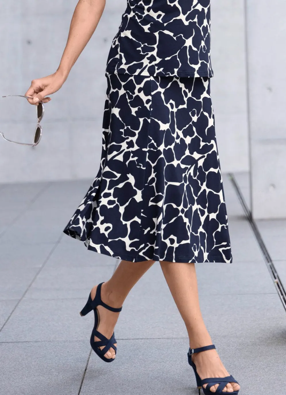 Jedes Teil ein Unikat! Mit sportivem Chic präsentiert sich dieser tragangenehme, marine-ecrufarbene Bahnenrock in schicker A-Linie: bequeme Schlupfform, glatt anliegend dank des innen liegenden, unsichtbaren Rundum-Dehnbundes, nach unten hin in leicht ausgestellter Form.