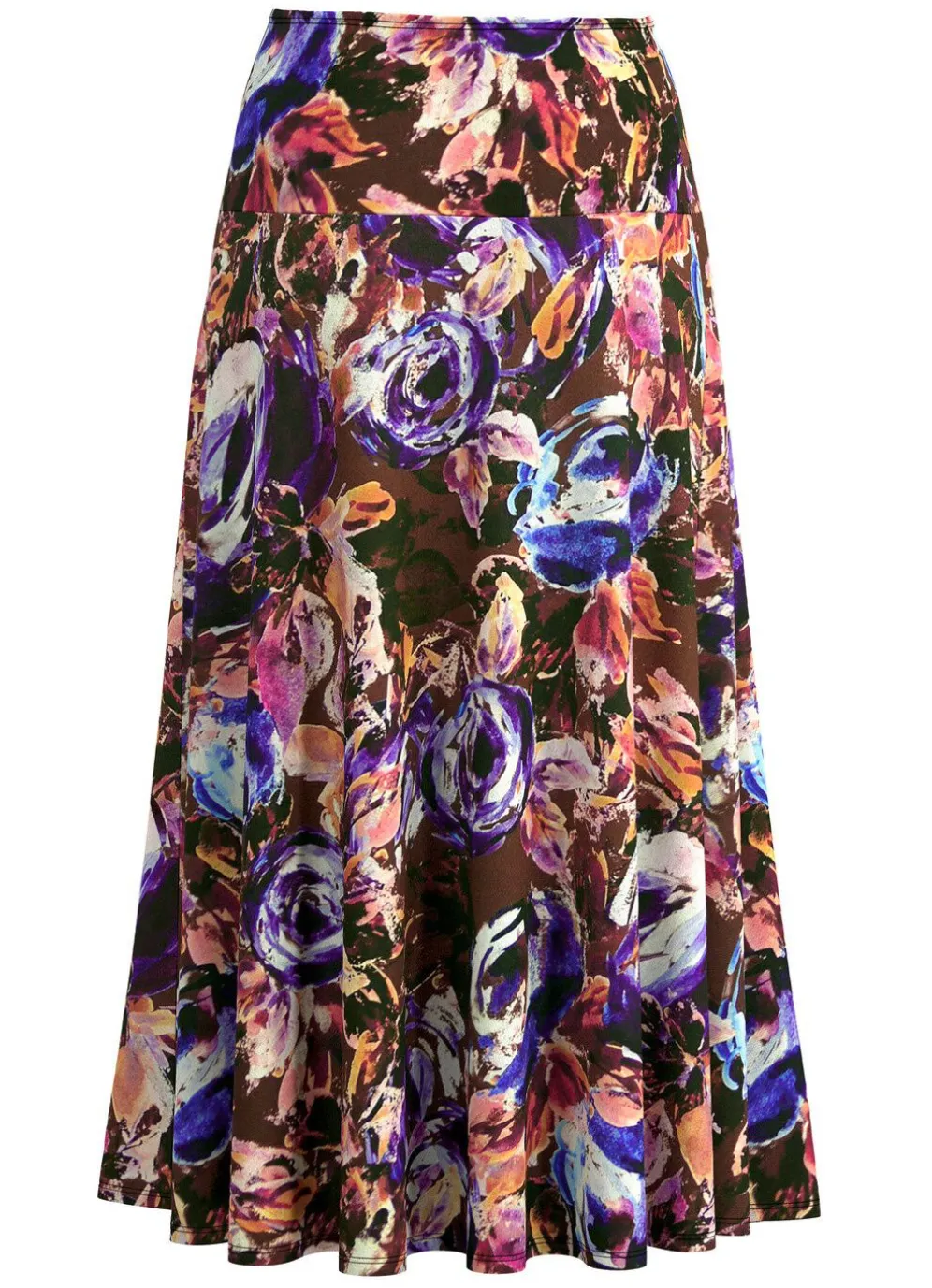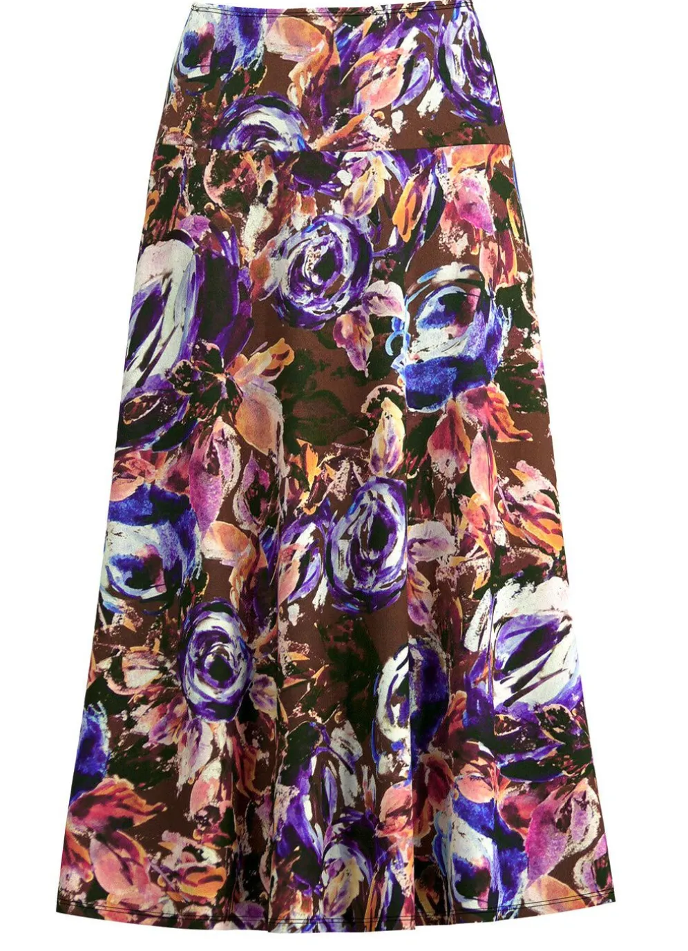 Jedes Teil ein Unikat! Ausdrucksstark dessinierter Rock in Braun-Bunt: figurgünstige, breite Passe rundum sowie bequeme Schlupfform mit schmalem Dehnbund rundum. Die leichte Tellerform verleiht diesem Modell seine duftige Weite. Gesamtlänge ca. 78 cm, bei K-Gr. ca. 72 cm.