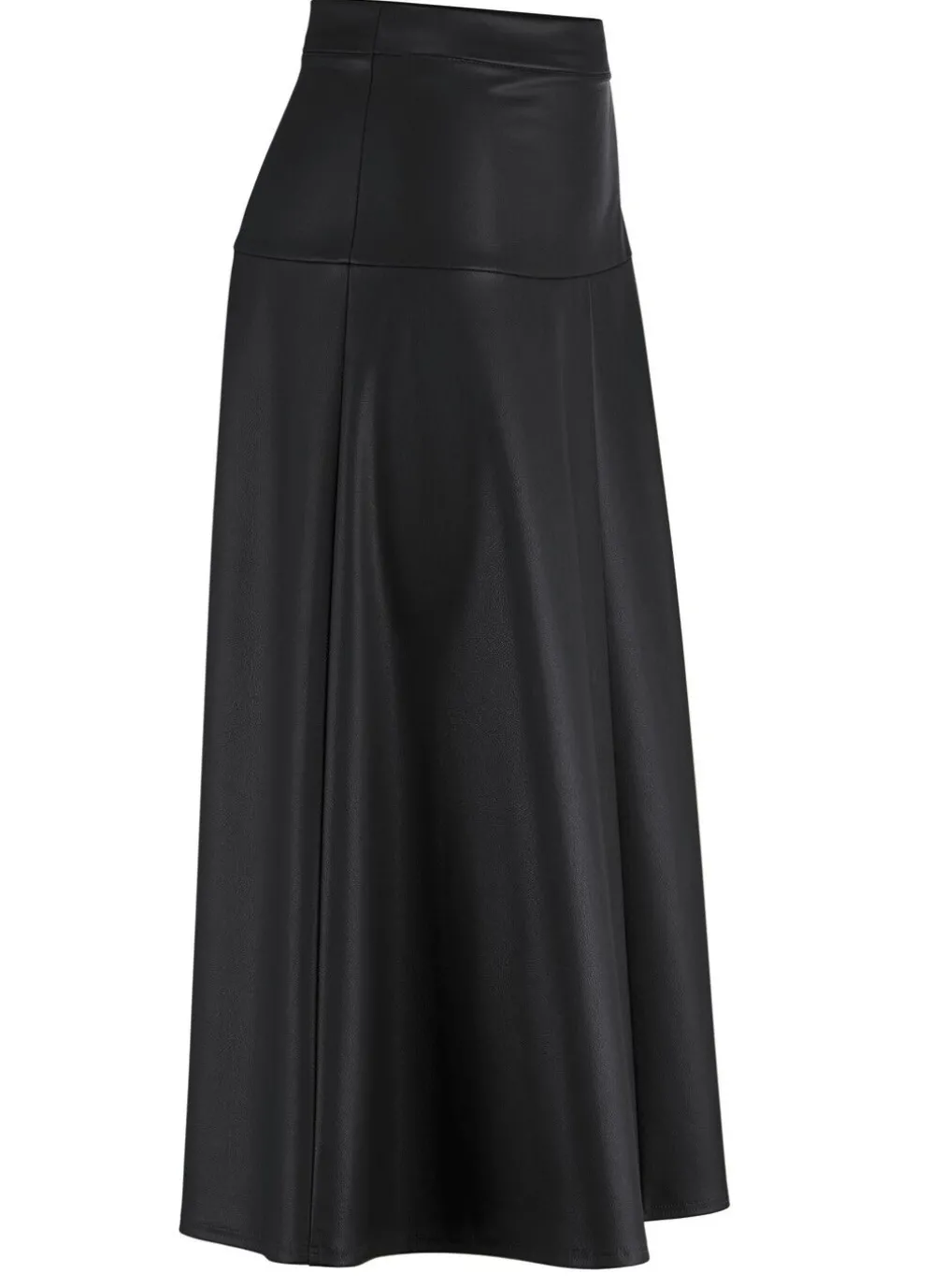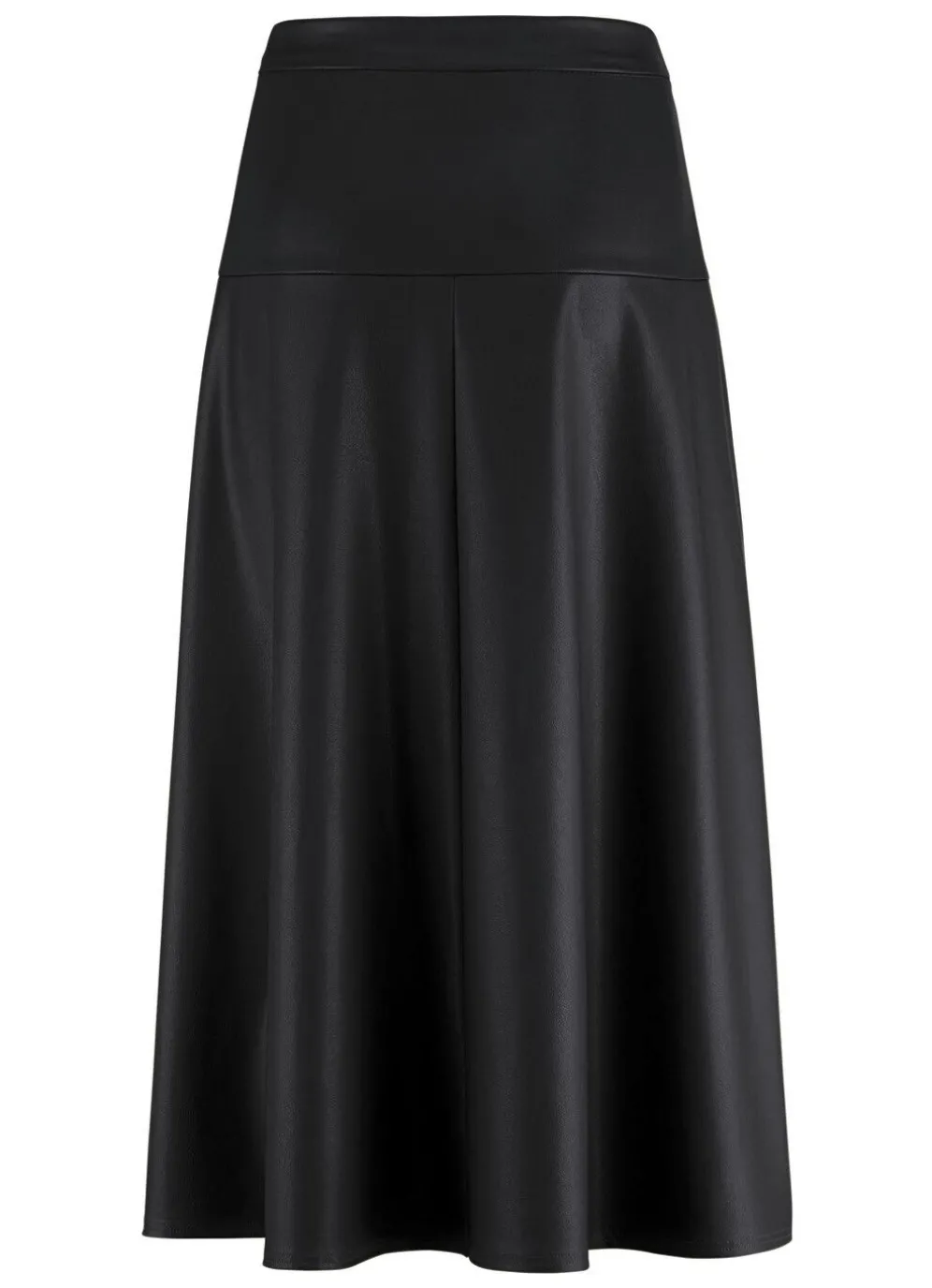 Voll im Trend liegt dieser tragangenehme Rock aus softem Nappaleder-Imitat in bequemer Schlupfform, glatt anliegend dank des innenliegenden, unsichtbaren Rundum-Dehnbundes, figurgünstige, breite Passe rundum sowie Teilungsnähte im Vorder- und Rückteil. Die leichte Tellerform verleiht diesem Modell seine schwingende Weite. Länge ab Taille ca. 78 cm, bei K-Gr. ca. 74 cm.