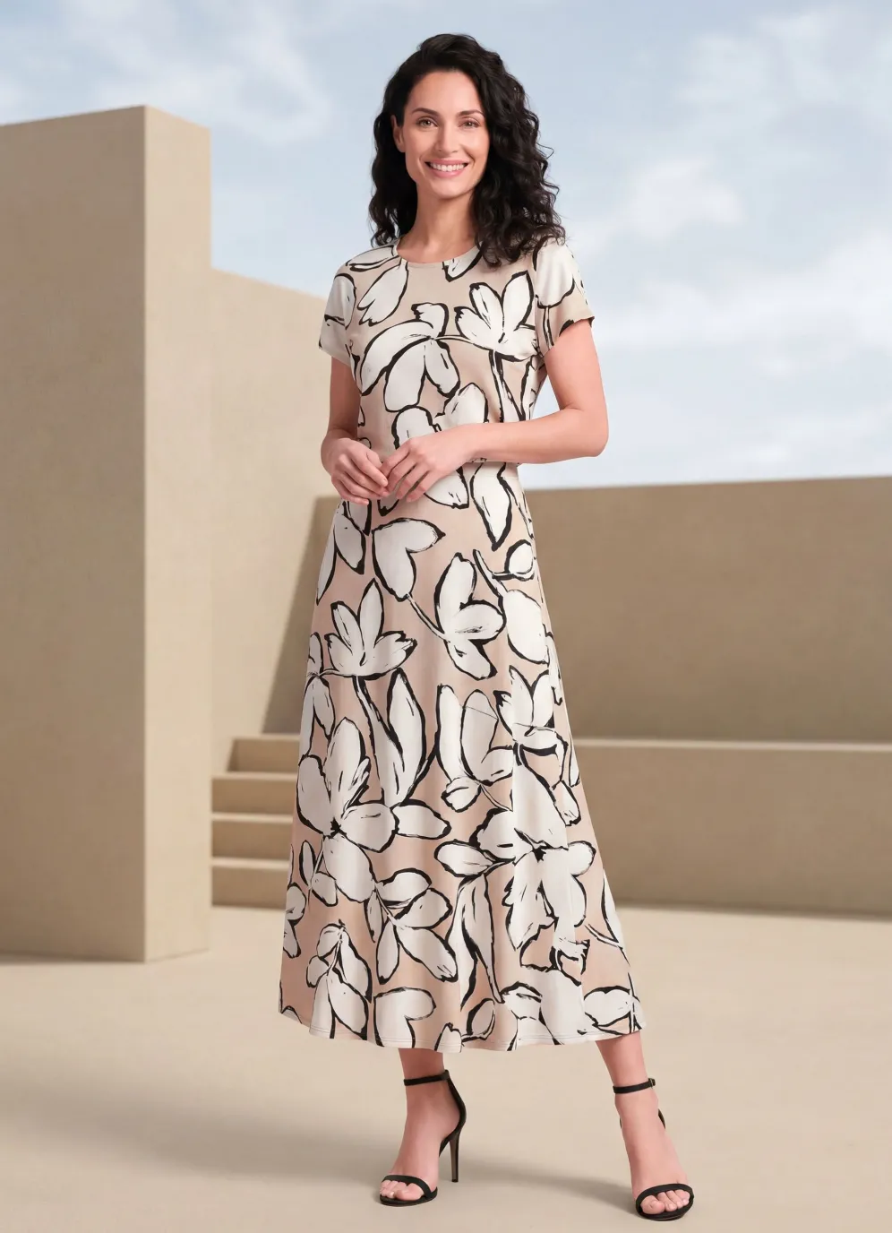 Jedes Teil in Unikat! Mit farbbrillantem Druck in Taupe-Ecru-Schwarz zeigt sich dieser weit schwingende Rock mit Passen vorne und hinten sowie elastischem Dehnbund rundum.