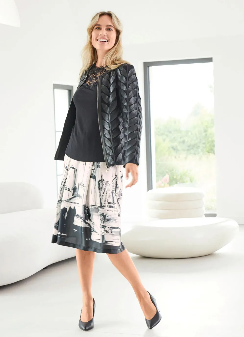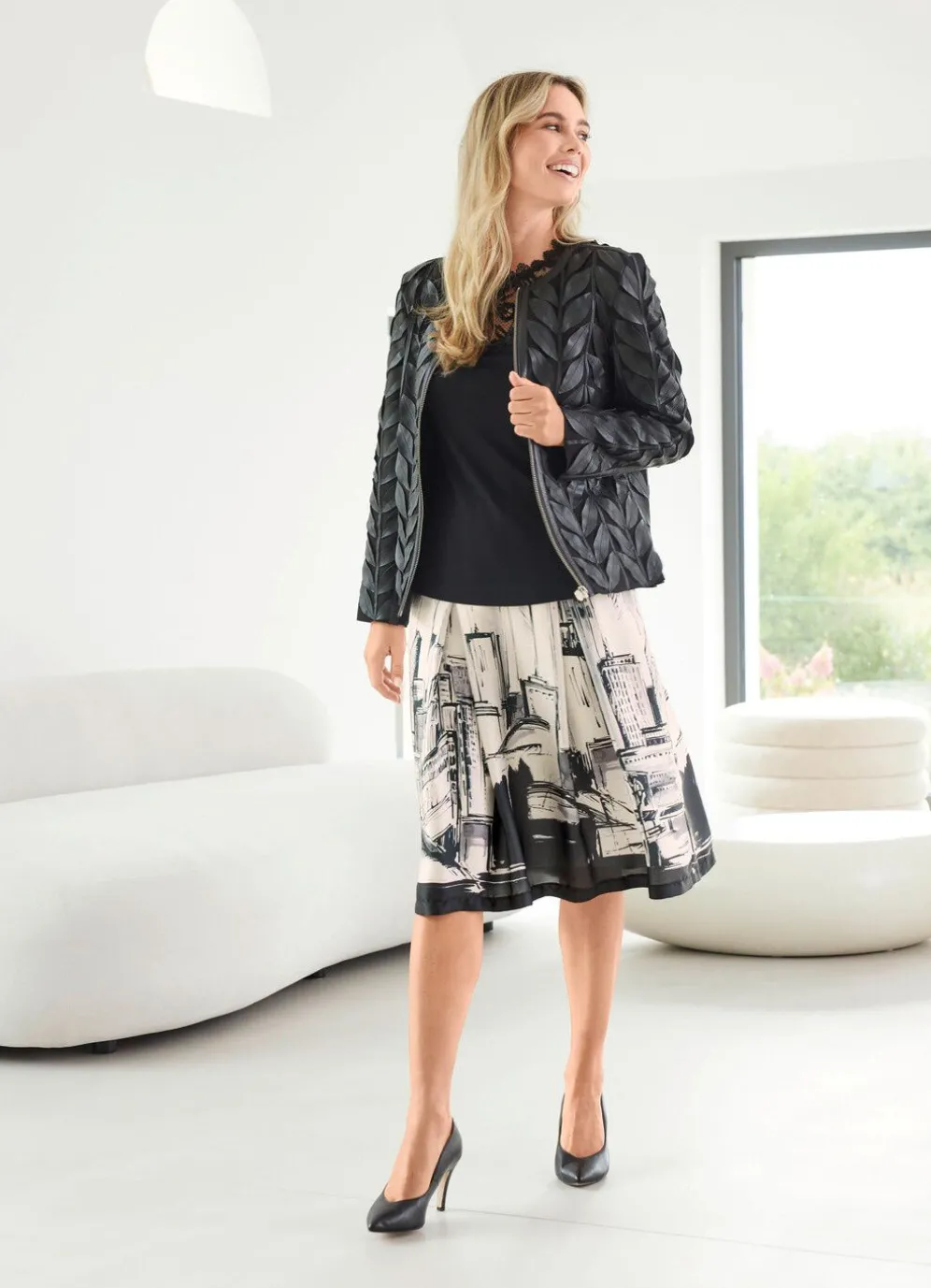 Wunderschöner, ecru-schwarz-grauer Rock von TIZIA, mit ausdrucksstarkem, farbbrillantem Druck, seitlichem Reißverschluss, breitem, schwarzen Bund, sowie tollen Kellerfalten rundum.