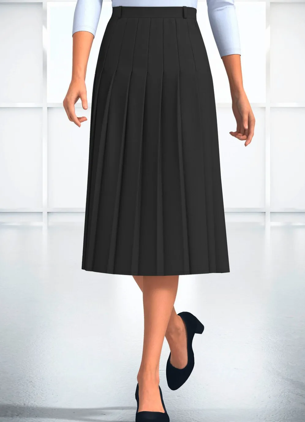 Komfortabler Rock mit seitlichen Dehnbundeinsätzen, Gürtelschlaufen, figurgünstigen Rundumfalten sowie Reißverschluss hinten. Gesamtlänge ca. 72 cm, bei K-Gr. 68 cm.