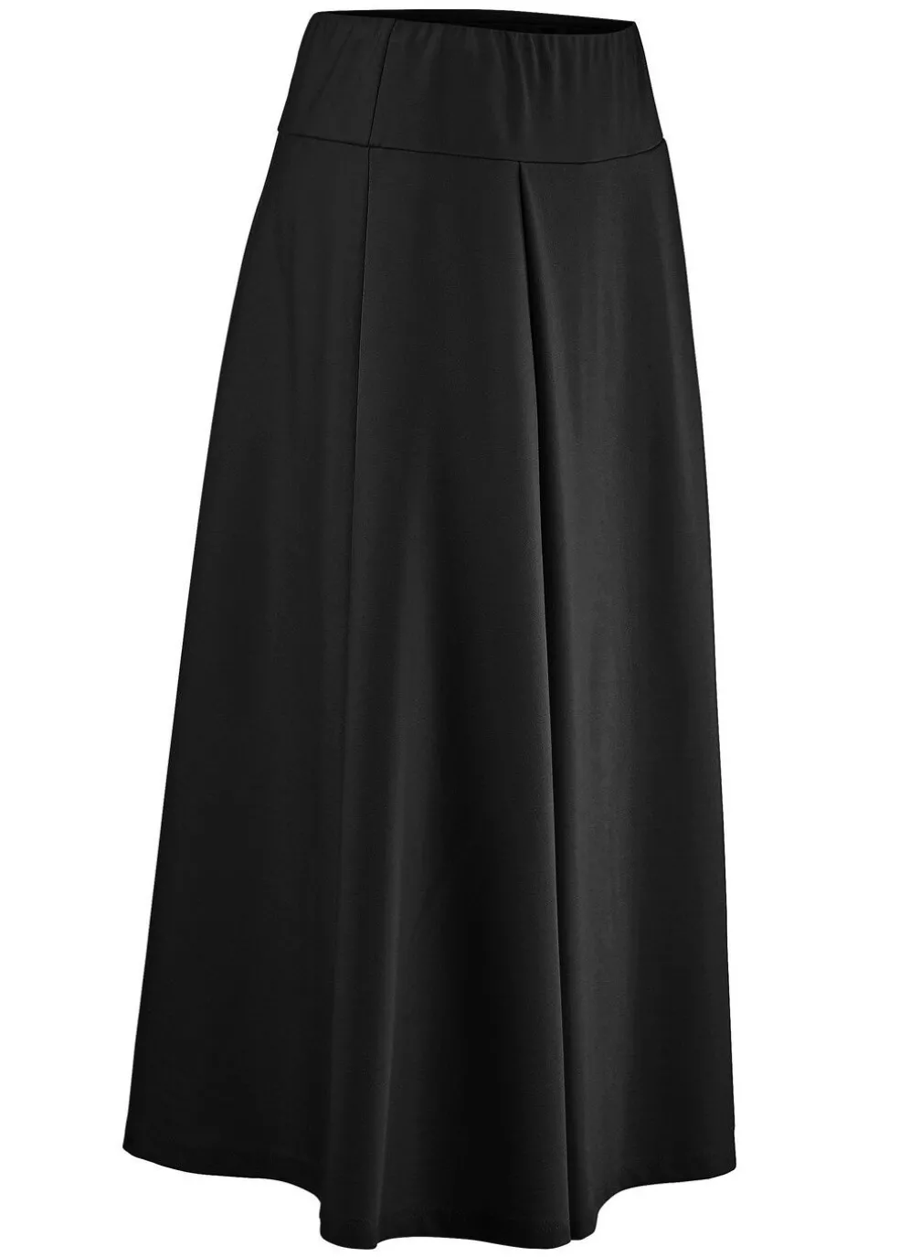 Wunderschöner, weit schwingender Rock: figurgünstige, breite Passe rundum und bequeme Schlupfform mit schmalem Dehnbund sowie gelegten Falten im Vorderteil. Gesamtlänge ca. 78 cm, bei K-Gr. ca. 74 cm.
