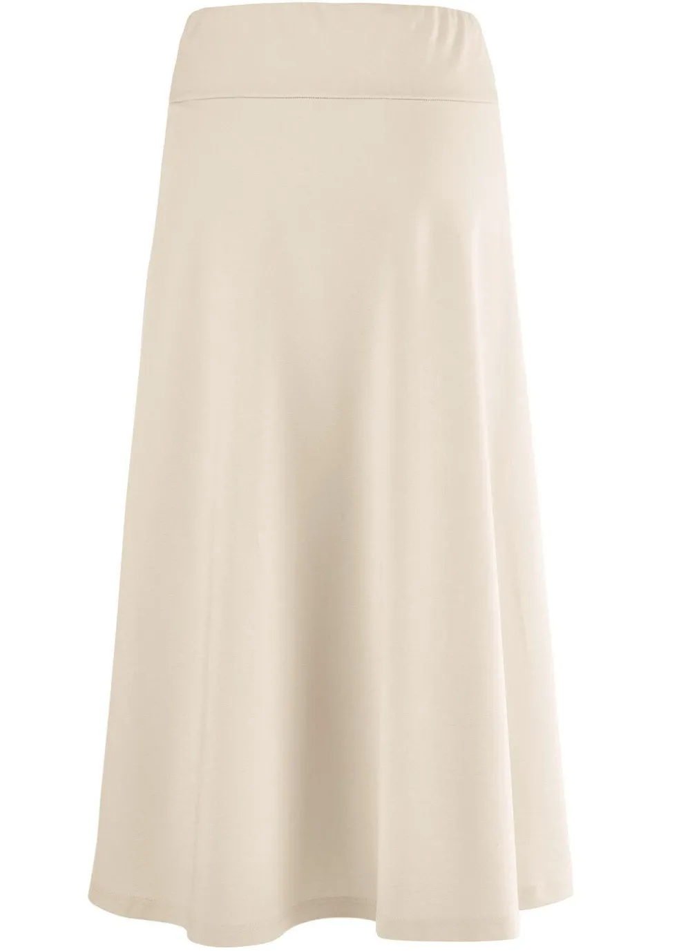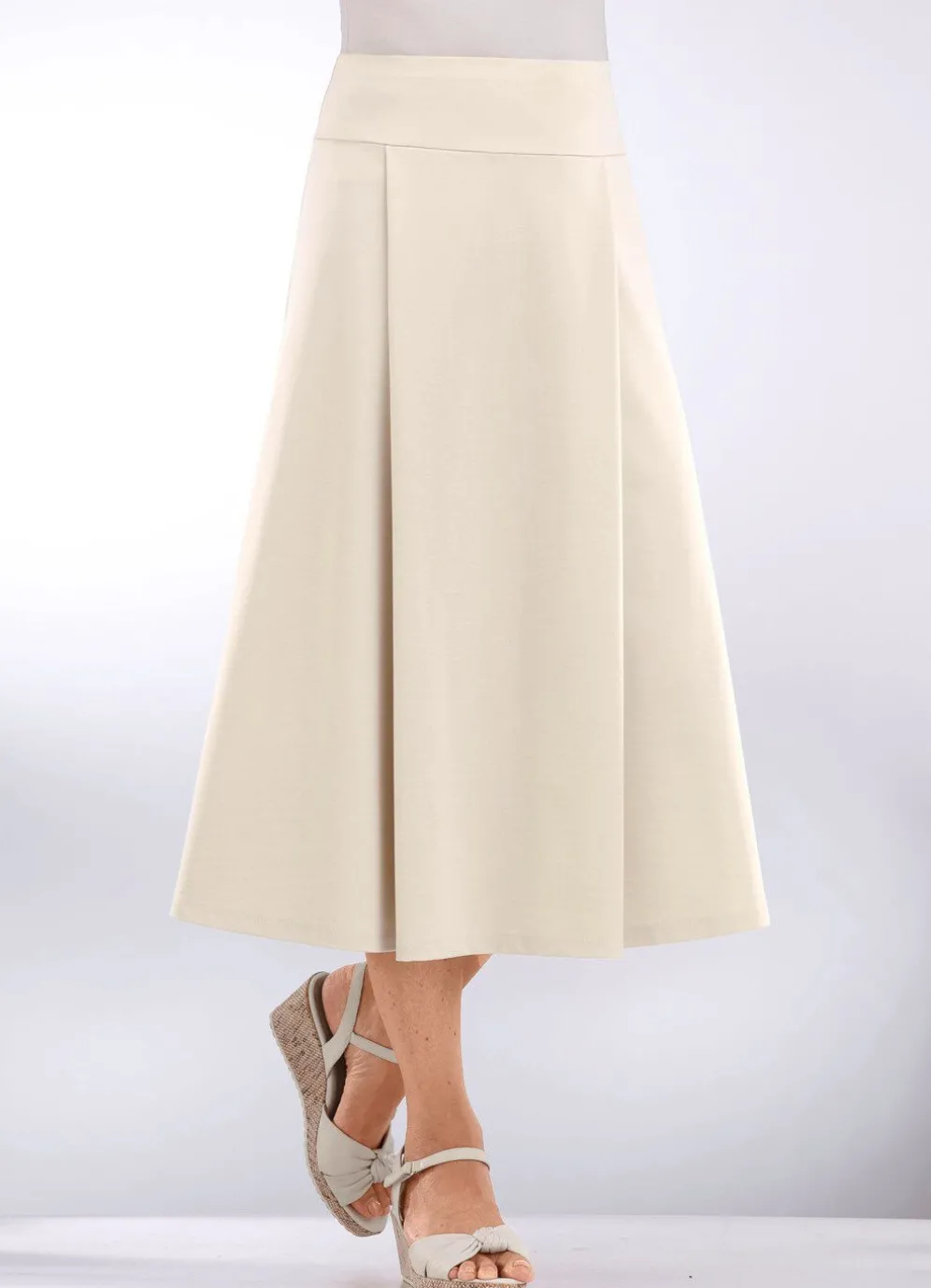 Wunderschöner, weit schwingender Rock: figurgünstige, breite Passe rundum und bequeme Schlupfform mit schmalem Dehnbund sowie gelegten Falten im Vorderteil. Gesamtlänge ca. 78 cm, bei K-Gr. ca. 74 cm.