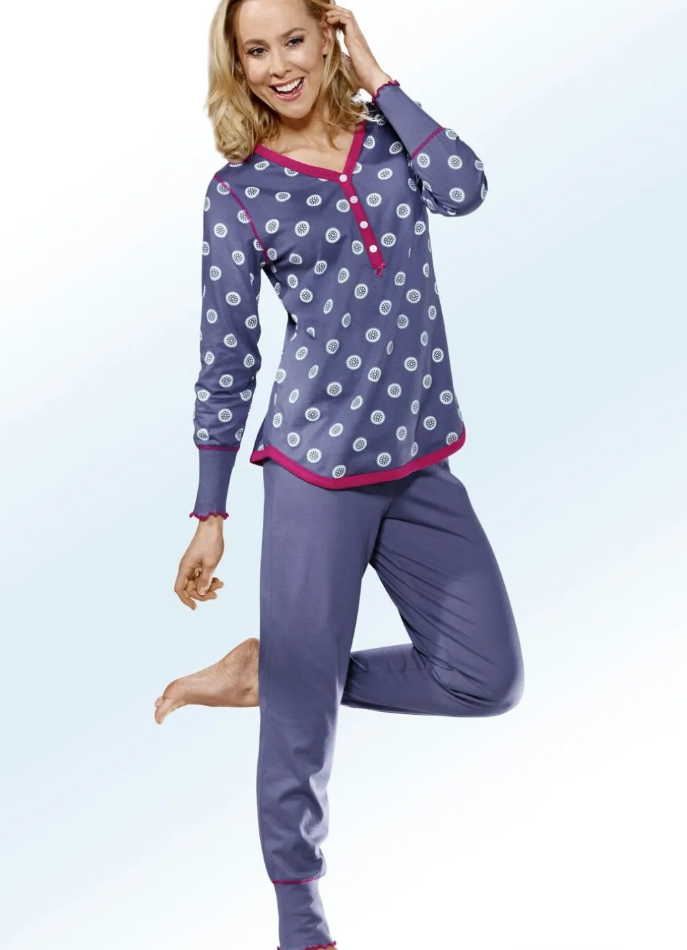 Süßer Schlafanzug mit gebogten Bündchenabschlüssen: Oberteil mit Knopfleiste, langen Ärmeln sowie abgerundetem Saum. Dazu gehört die lange Hose mit breitem Dehnbund.