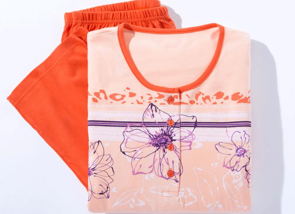 Hübscher Schlafanzug: Oberteil mit Knopfleiste, platziertem Druck vorne sowie an den 3/4-langen Ärmeln. Dazu die wadenlange Hose mit Dehnbund und seitlichem Schlitz an den offenen Beinabschlüssen.