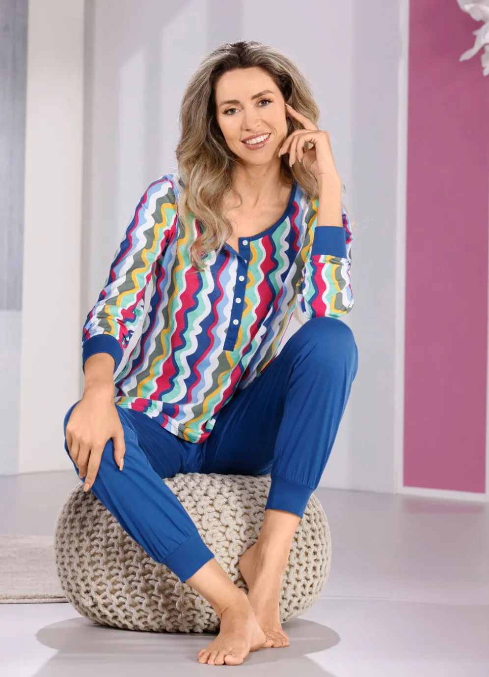 Umwerfender Schlafanzug in Jeansblau-Bunt mit Bündchenabschlüssen! Oberteil: Einfassung