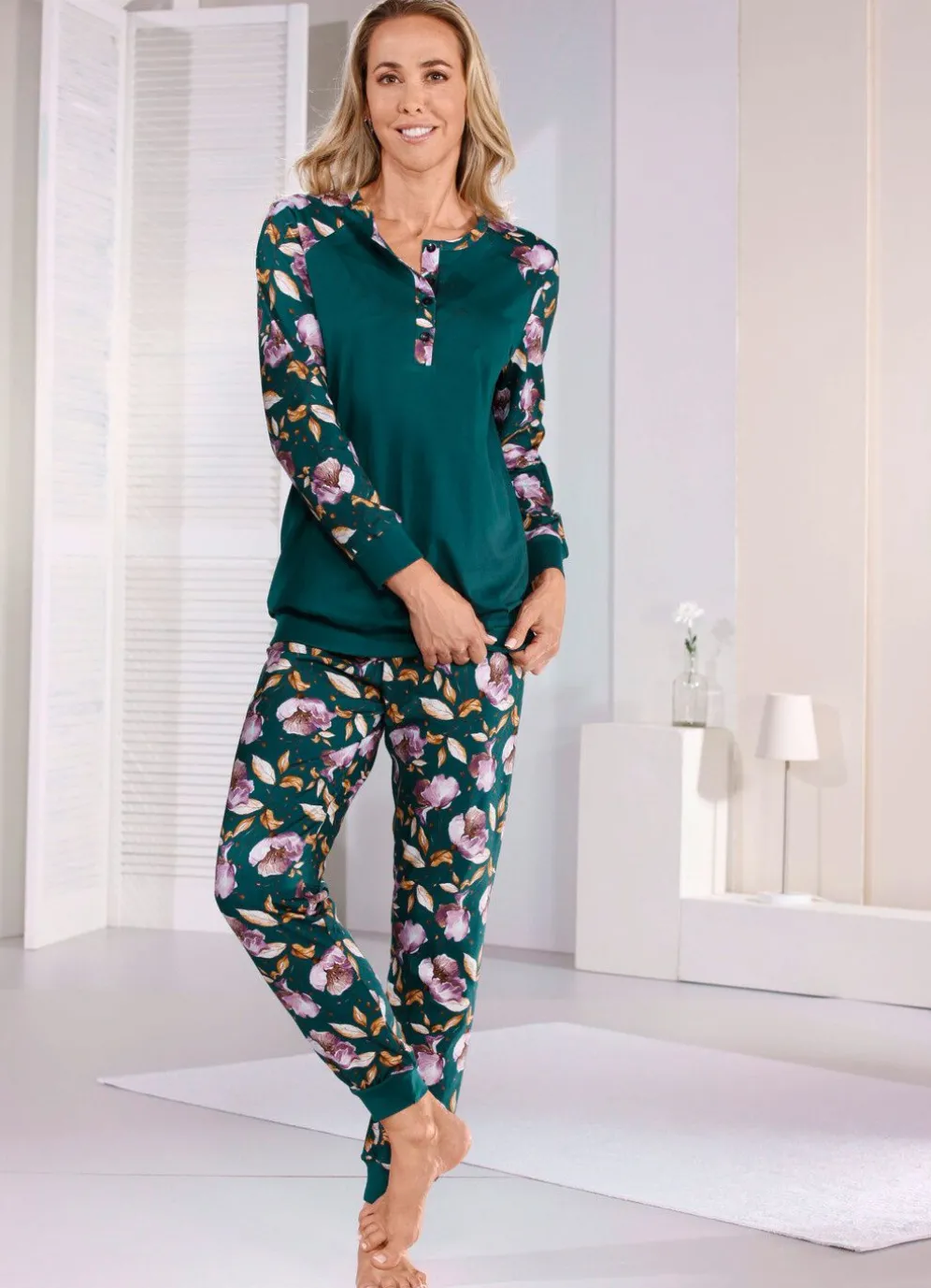 Ansprechender Schlafanzug in Petrol-Flieder-Bunt, mit Bündchenabschlüssen. Oberteil mit