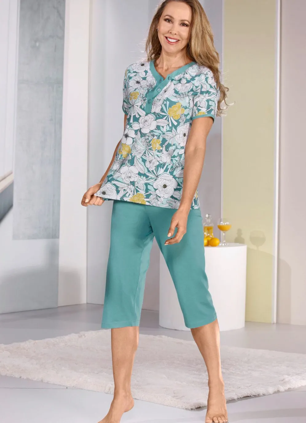 Toller Schlafanzug in Jade-Bunt! Oberteil mit Blende, V-Ausschnitt, Knopfleiste sowie kurzen Ärmeln mit Einfassung. Dazu die wadenlange Hose mit Dehnbund und offenen Beinabschlüssen.