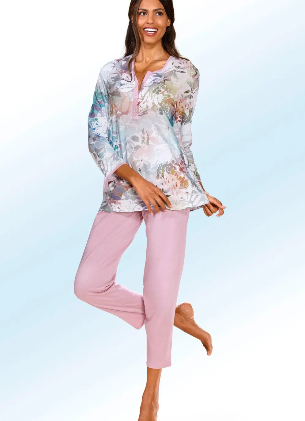 Wunderhübscher Schlafanzug! Das Oberteil ist mit Einfassungen, Knopfleiste sowie langen Ärmeln gearbeitet. Die 7/8-lange Hose zeigt sich mit Dehnbund sowie offenen Beinabschlüssen.