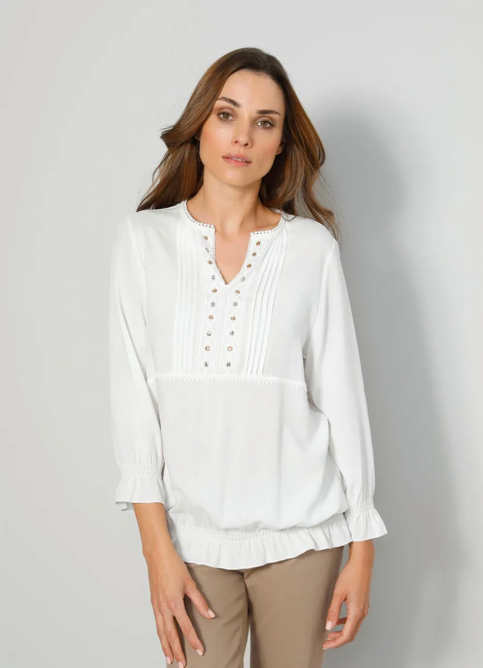 Bluse mit Rundhals und V-Ausschnitt. Darüber hinaus ist sie gerade geschnitten. Die 3/4-lange Ärmel sind mit einem Gummizug und Rüschen ausgestattet.