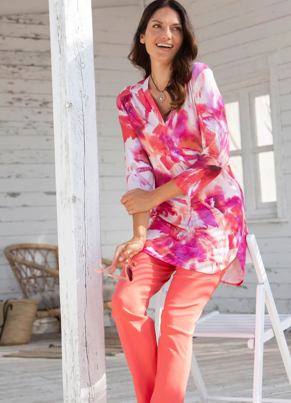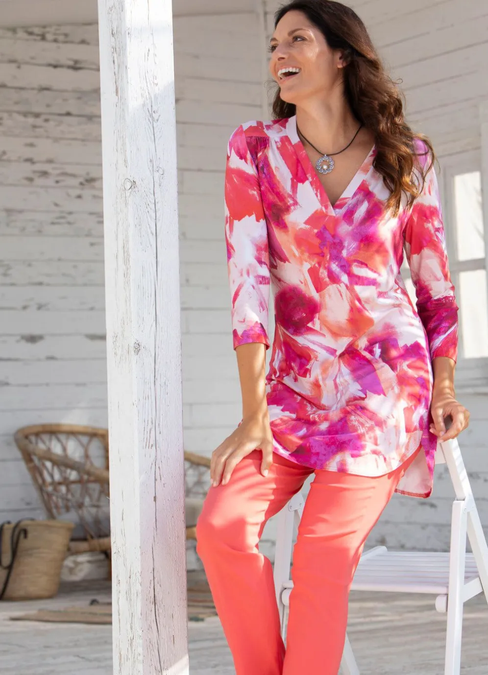 Ausdrucksstark dessinierte Shirt-Tunika mit farbbrillantem Druck in Koralle-Pink-Weiß-Bunt, V-Ausschnitt, Fältelung an der Vorderpasse sowie 3/4-lange Ärmel.