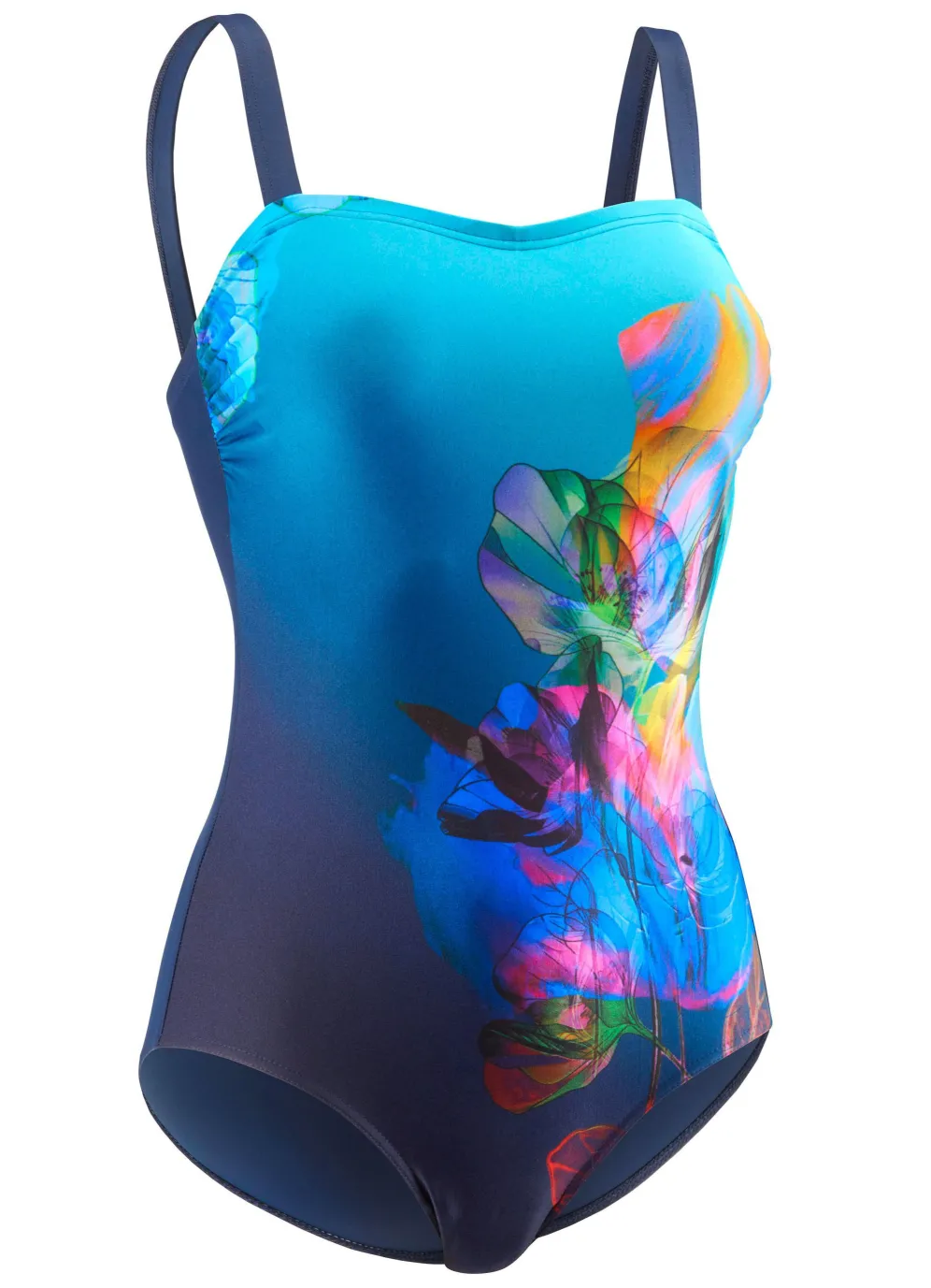 Marinefarbener „Schwab“-Badeanzug in Bandeauform mit platziertem Druckdessin im Vorderteil. Halbkorsage, Softschalen und Unterbrustband.