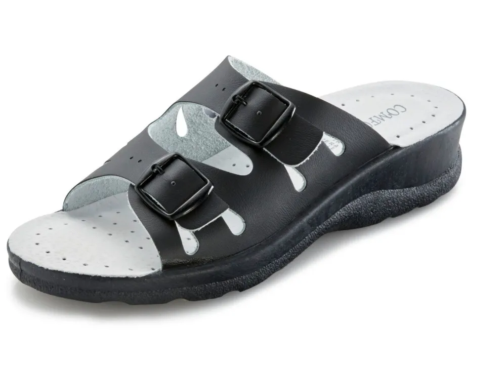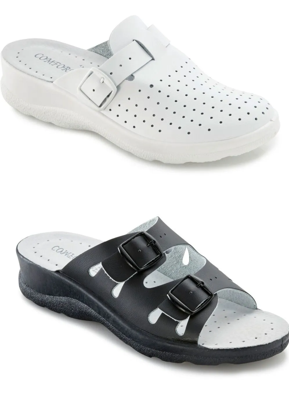 Set: Pantolette in Schwarz und Clog in Weiß, jeweils aus Kalb-Nappaleder mit verstellbaren Spangen: in Weite H, gepolstertes Lederfußbett, PVC-Laufsohle sowie 30 mm Keilabsatz