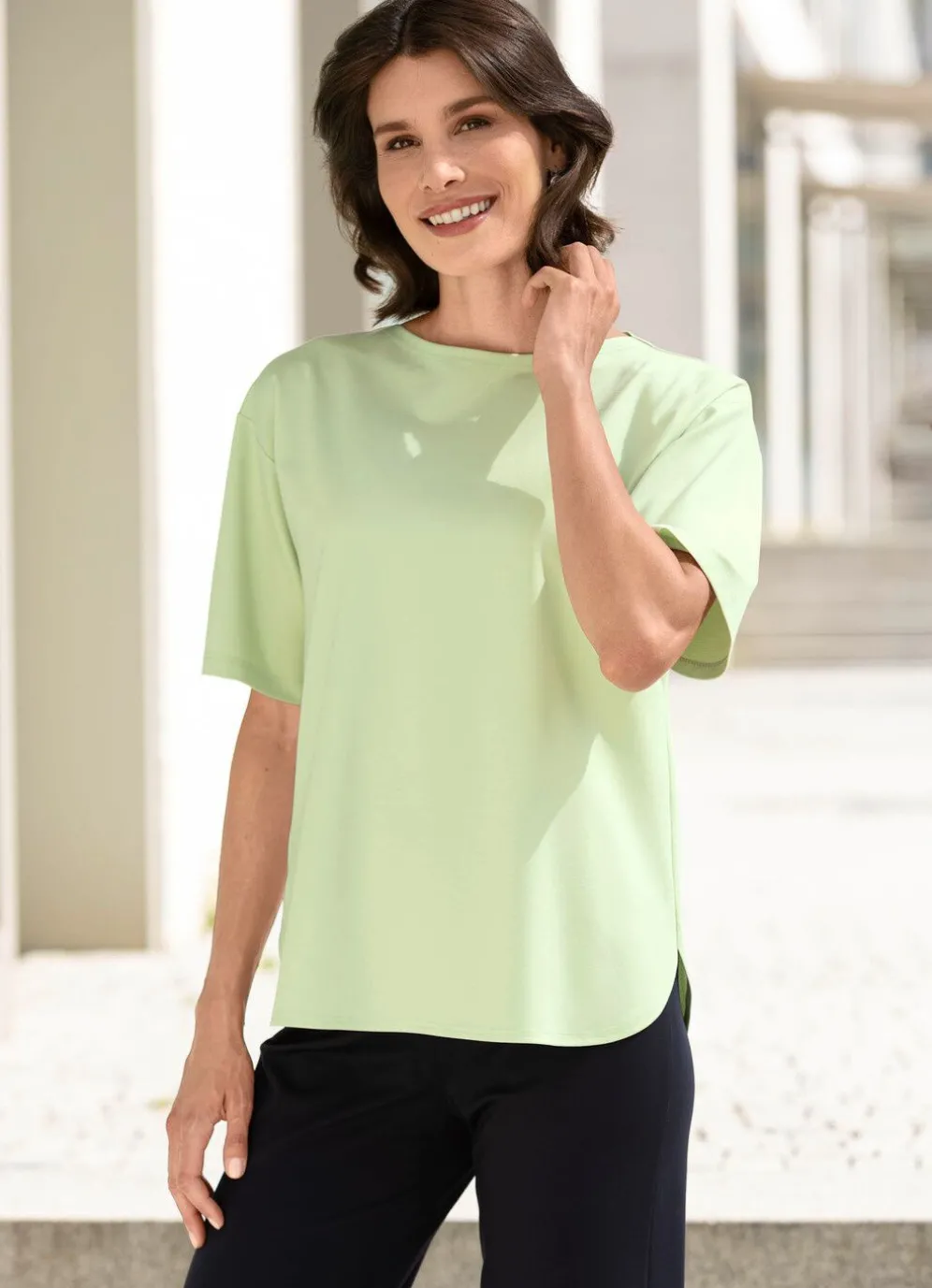 Flottes Shirt mit rundem Halsausschnitt, in weiter Form und abgerundetem Saumabschluss. Länge ca. 65 cm, ab Gr. L ca. 68 cm.
