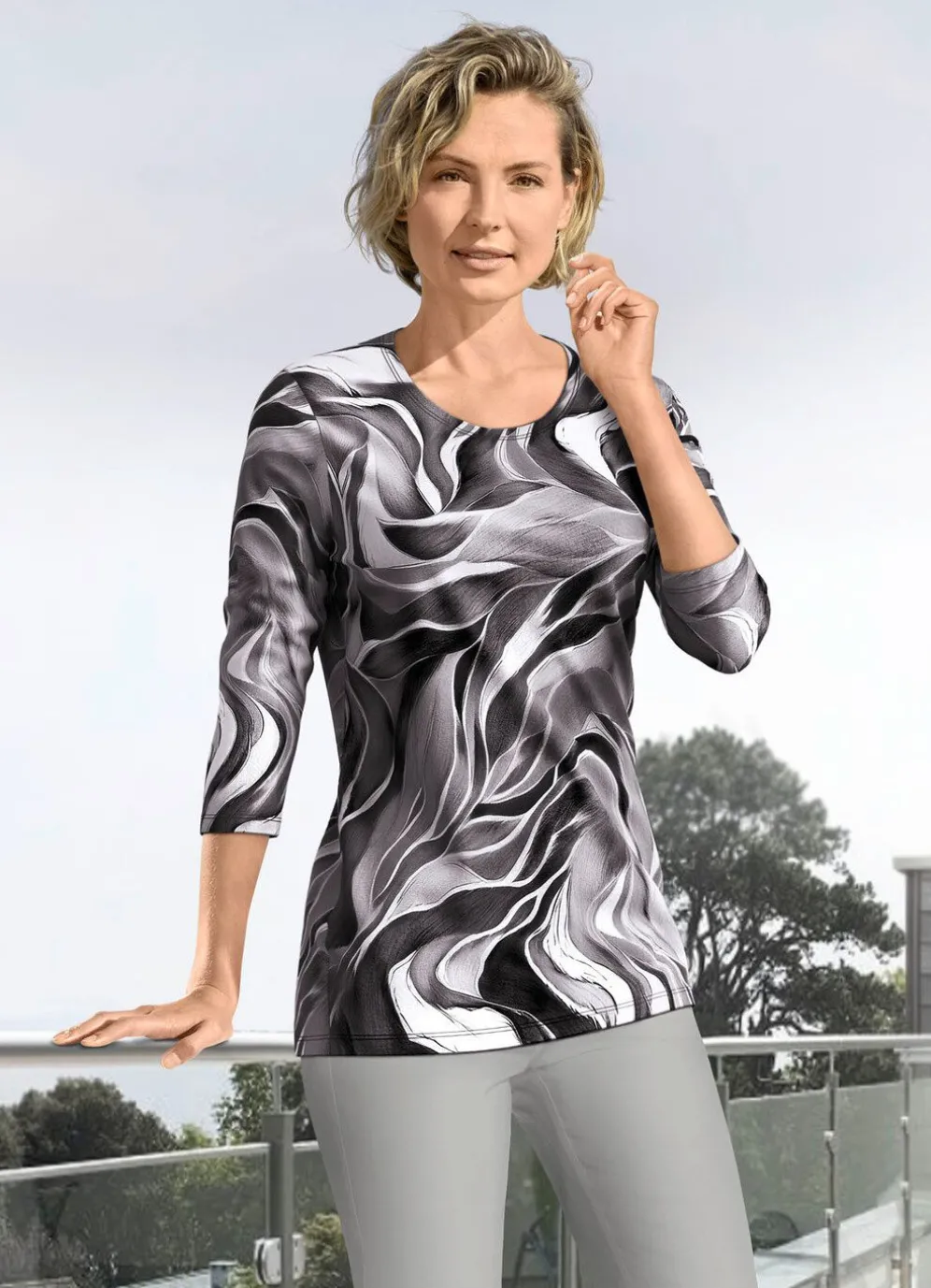 Jedes Teil ein Unikat! Attraktives Shirt mit farbbrillantem Allover-Druck und 3/4-langen Ärmeln.